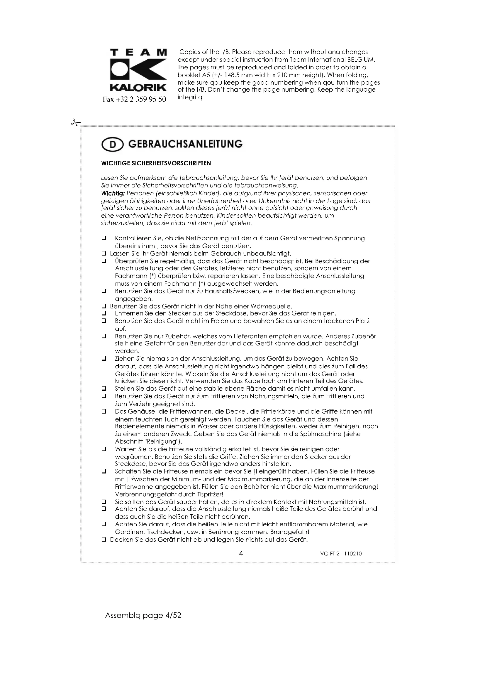 Benutzen Sie das Gerät nur zum Frittieren von Nahrungsmitteln, die zum Frittieren und zum Verkehr geeignet sind.