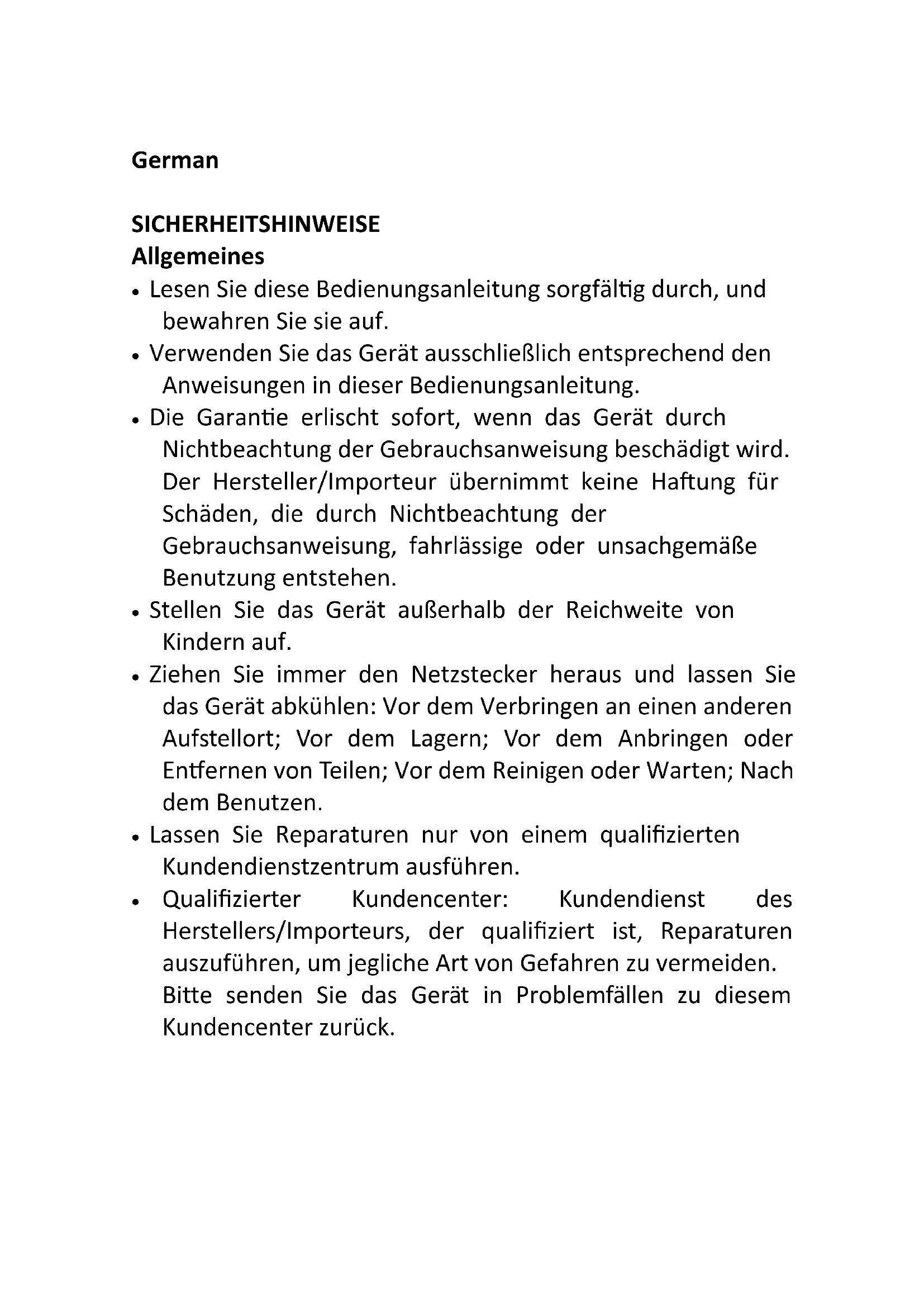 Qualifizierter Kundencenter: Kundendienst des Herstellers/Importeurs, der qualifiziert ist, Reparaturer auszufahren, um jegliche Art von Gefahren zu vermeiden.itte senden Sie das Gerät in Problemfällen zu dieser Kundencenter darüber.