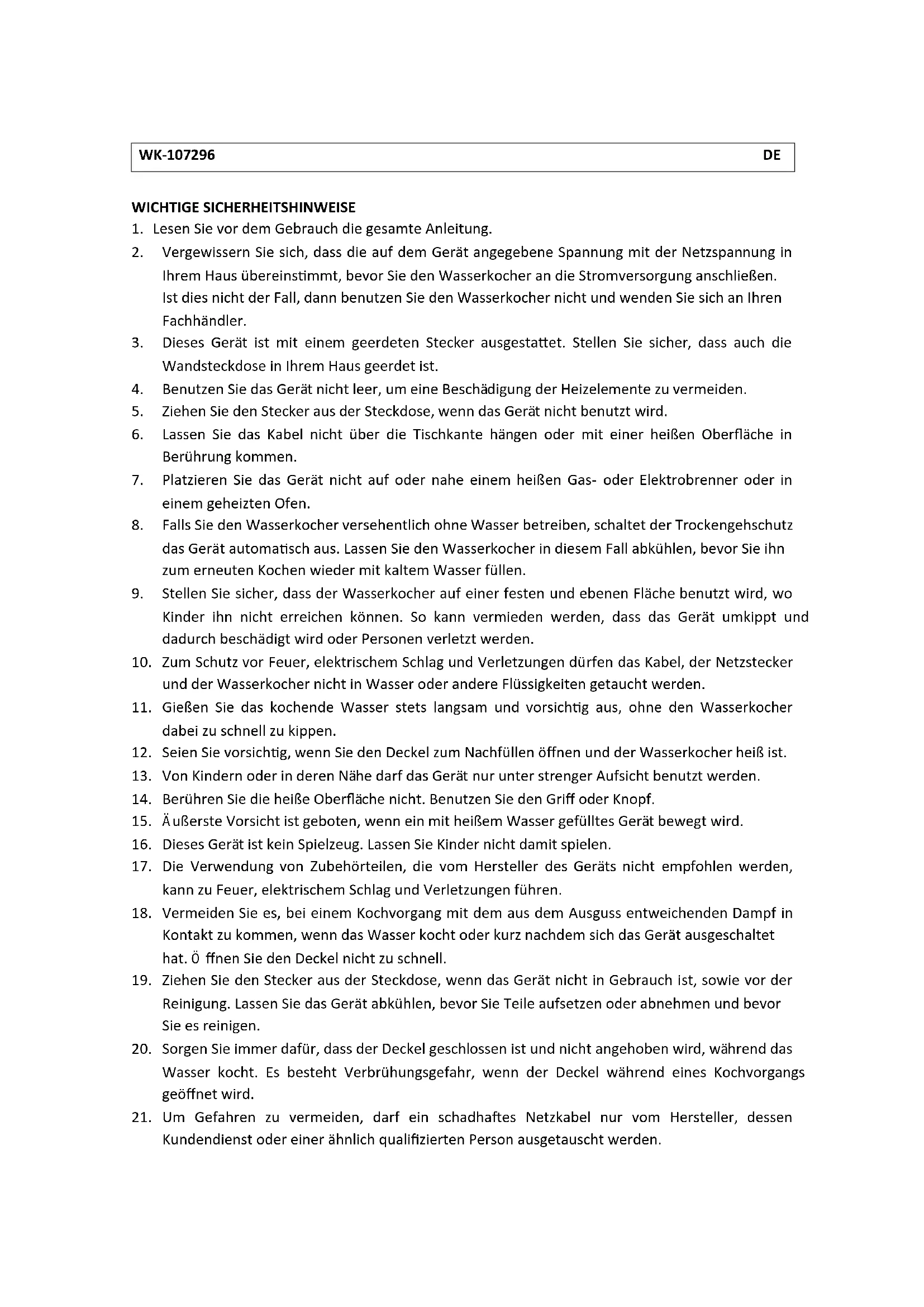 - Zum Schutz vor Feuer, elektrischem Schlag und Verletzungen dürfen das Kabel, der Netzstecker und der Wasserkocher nicht in Wasser oder andere Flüssigkeiten getaucht werden.