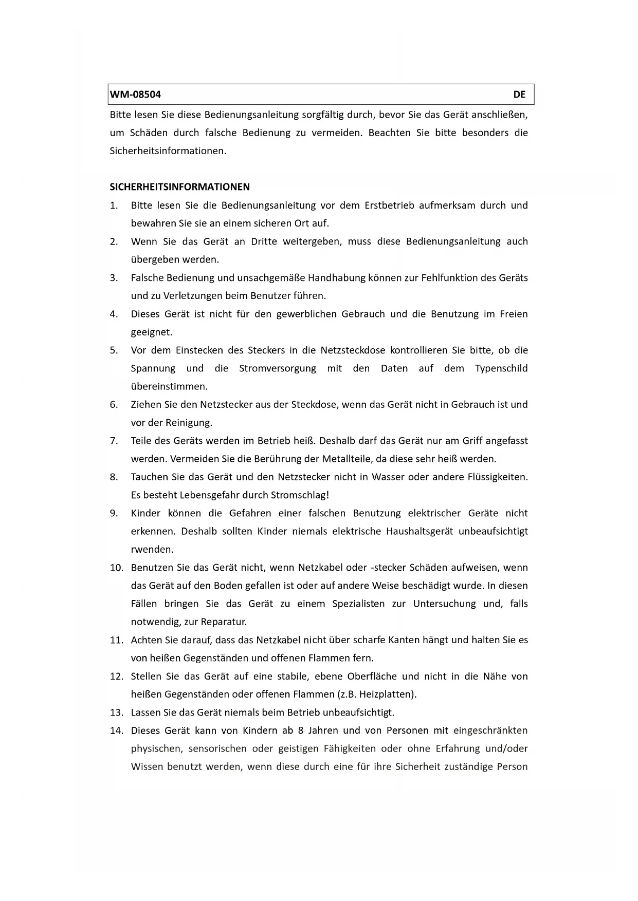 9. Kinder können die Gefahren einer falschen Benutzung elektrischer Geräte nicht erkennen. Deshalb sollen den Kinder niemals elektrische Haushaltsgerät unbeaufsichtigt rwenden.