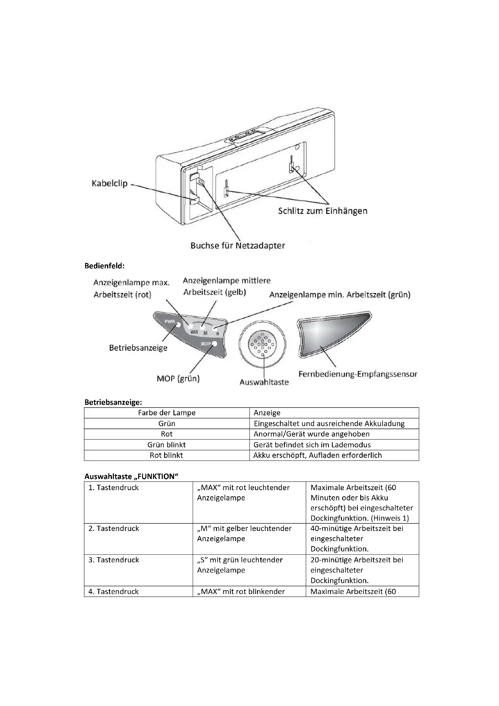 | 1. Tastendruck | “MAX” mit rot leuchtender Anzeigelampe | Maximale Arbeitszeit (60 Minuten oder bis Akku erschöpf) bei eingeschalteter Dockingfungkoment. (Hinweis 1) |