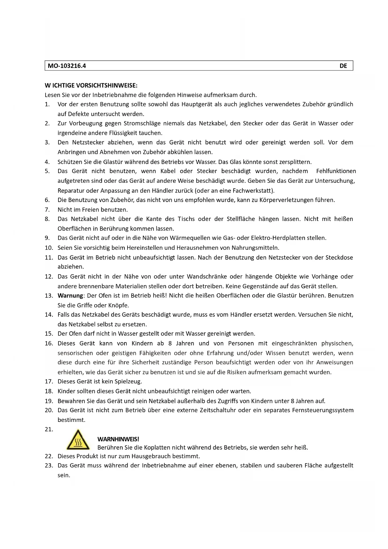 - Warning: Der Ofen ist im Betrieb frei! Nicht die bereits Oberflächen oder die Glastür berühren. Benutzen Sie die Griffe oder Knöppe.