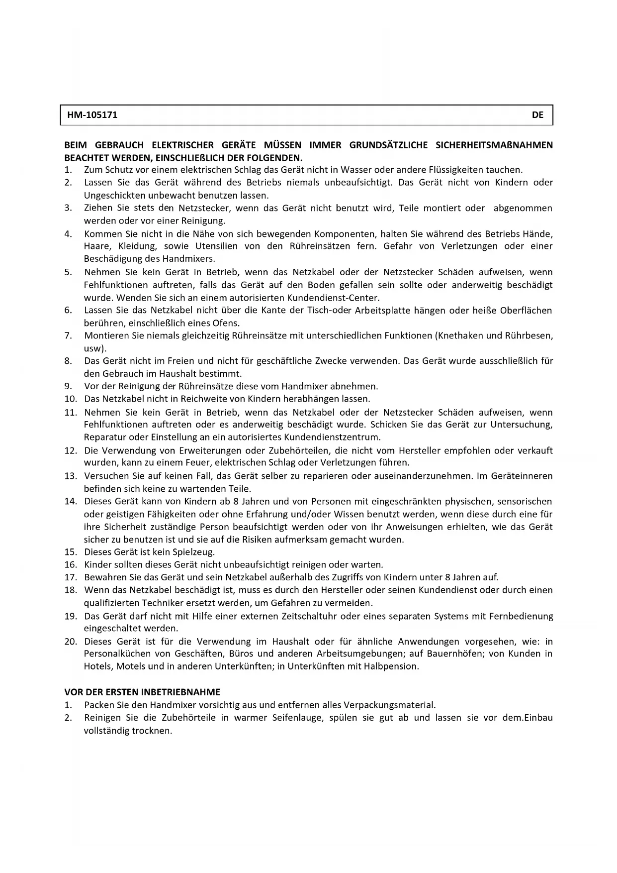 - Kommen Sie nicht in die Nähe von sich bewegenden Komponenten, halten Sie während des Betriebs Hände, Haare, Kleidung, sowie Utensilien von den Rühreinsätzen fern. Gefahr von Verletzungen oder einer Beschädigung des Handmixers.