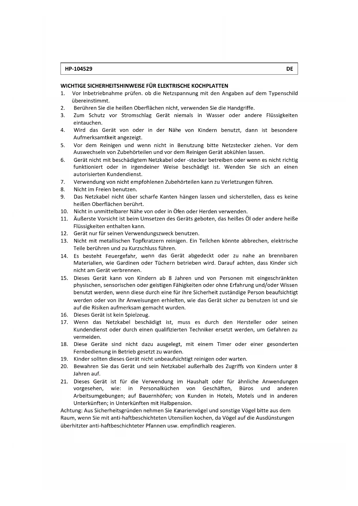 WICHTIGE SICHERHEITSHINWEISE FÜR ELEKTRISCHE KOCHPLATTEN
