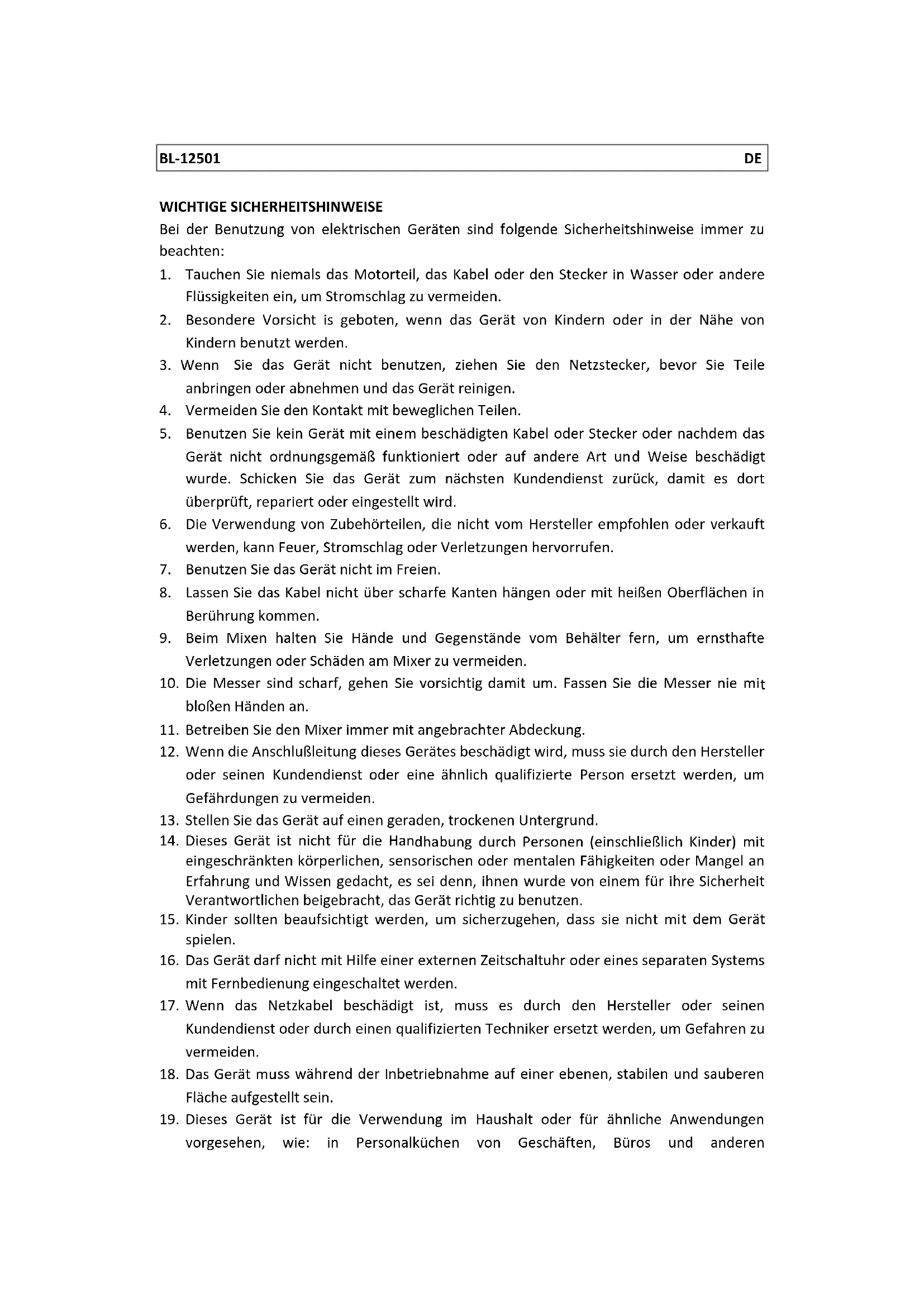 - Beim Mixen halten Sie Hände und Gegenstände vom Behälter fern, um ernsthafte Verletzungen oder Schäden am Mixer zu vermeiden.
