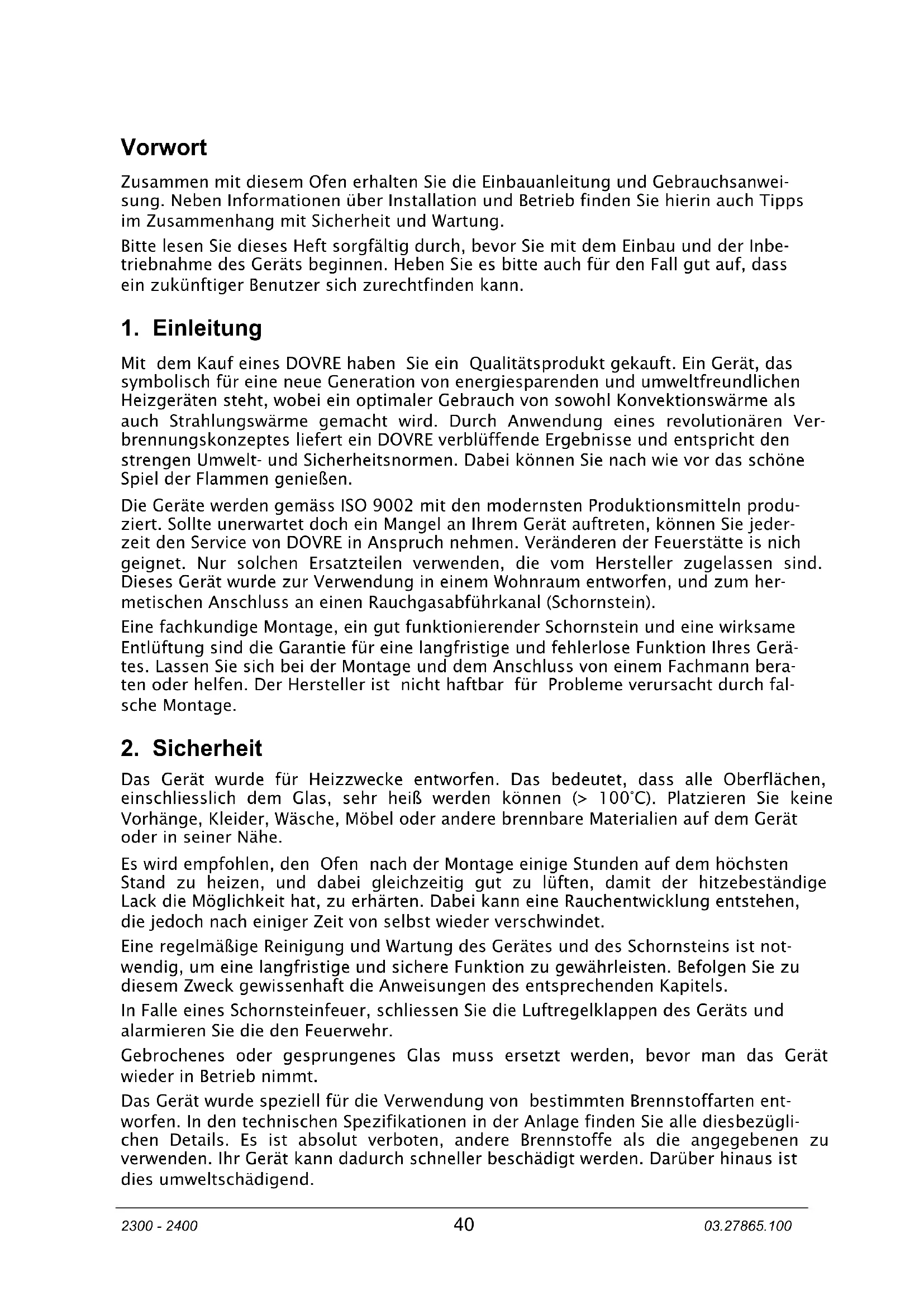 Die Geräte werden gemäss ISO 9002 mit den modernsten Produktionsmittelnprodukziert. Sollte unerwartet noch ein Mangel an Ihrrem Gerät auftreten, konnen Sie jederzeit den Service von DOVRE in Anspruchnehmen. Veränderen der Feuerstände is nich geignet. Nur solchen Ersatzteilen verwenden, die vom Hersteller zugelassen sind. Dieses Gerät wurde zur Verwendung in einem Wohnraum entworfen, und zum hermetischen Anschluss an einen Rauchgasabführkanal (Schornstein).