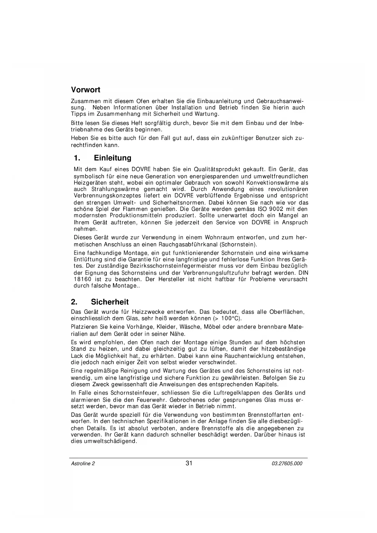 Der Astroline 2arf nur mit geschlossen und verriegeltem Sichtfenstertur betrieben werden. Er kann am bereits belegte Schornsteine angeschlossen werden und ist aus Sicherheitsgrunden mit einem verriegelten Sichfenstertur und ein kleiner Fültlur (bauart 1) ausgestattet.