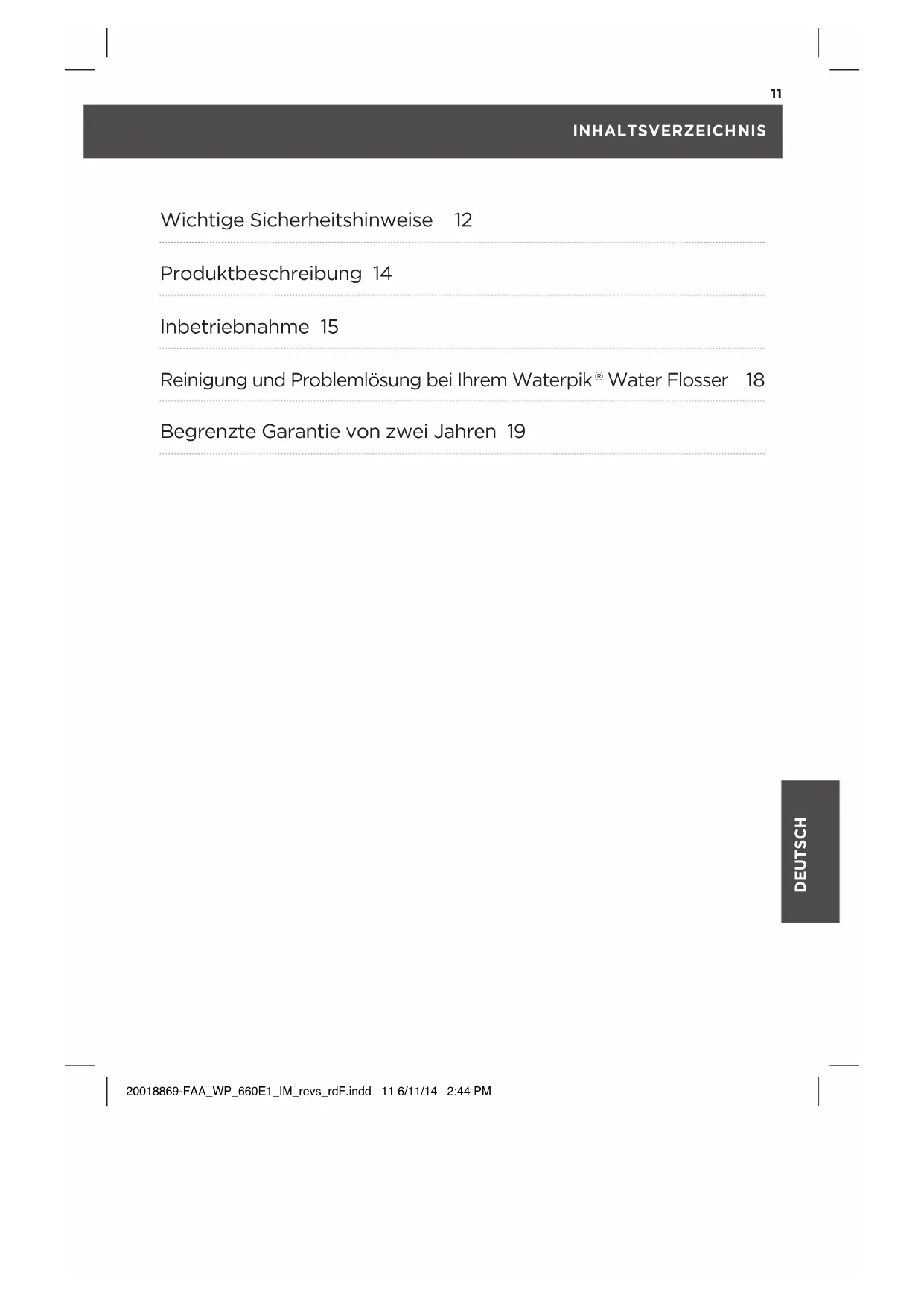 Water Pik, Inc. garantiert dem Originalkauf/ Besitzer theses Produkte, dass das Produkt für zwei Jahre ab Kaufdatum frei von Material- und Verarbeitungsfehlern ist.itte haben Sie ihre Quittung/Rechnung als Nachweis des Kaufdatumsauf.Water Pik,Inc. behalt sich das Recht vor, vom reklamierenden Kunden zu verlangen, das Produkt fur die Analyse zurückzusenden,damit wir bestätigen konnen,dass die angegebenen Mangel durch unsere Garantiebestimmungen gedeckt sind.Wir werden jedem Teil des Produkts ersetzen,das unserer Meinung nach fehlerhaft ist, sofern das Produkt nicht falsch angewendet, missbrauchlich verwendet,verändert,oder nach dem Kauf beschadigt wurde und wenn es entsprechend dieser Anleitung verwendet wurde. Reparatur oder Ersatzleistungen fur die Garantie werden von ortlichen Handlern ausgefuhrt, deren Kontaktdaten auf www.waterpik.com/intl gefunden werden konnen. These Garantie schlieBt Zubehor oder Verschleisteile,wie Aufsätze,Burstenkope, usw. aus.
