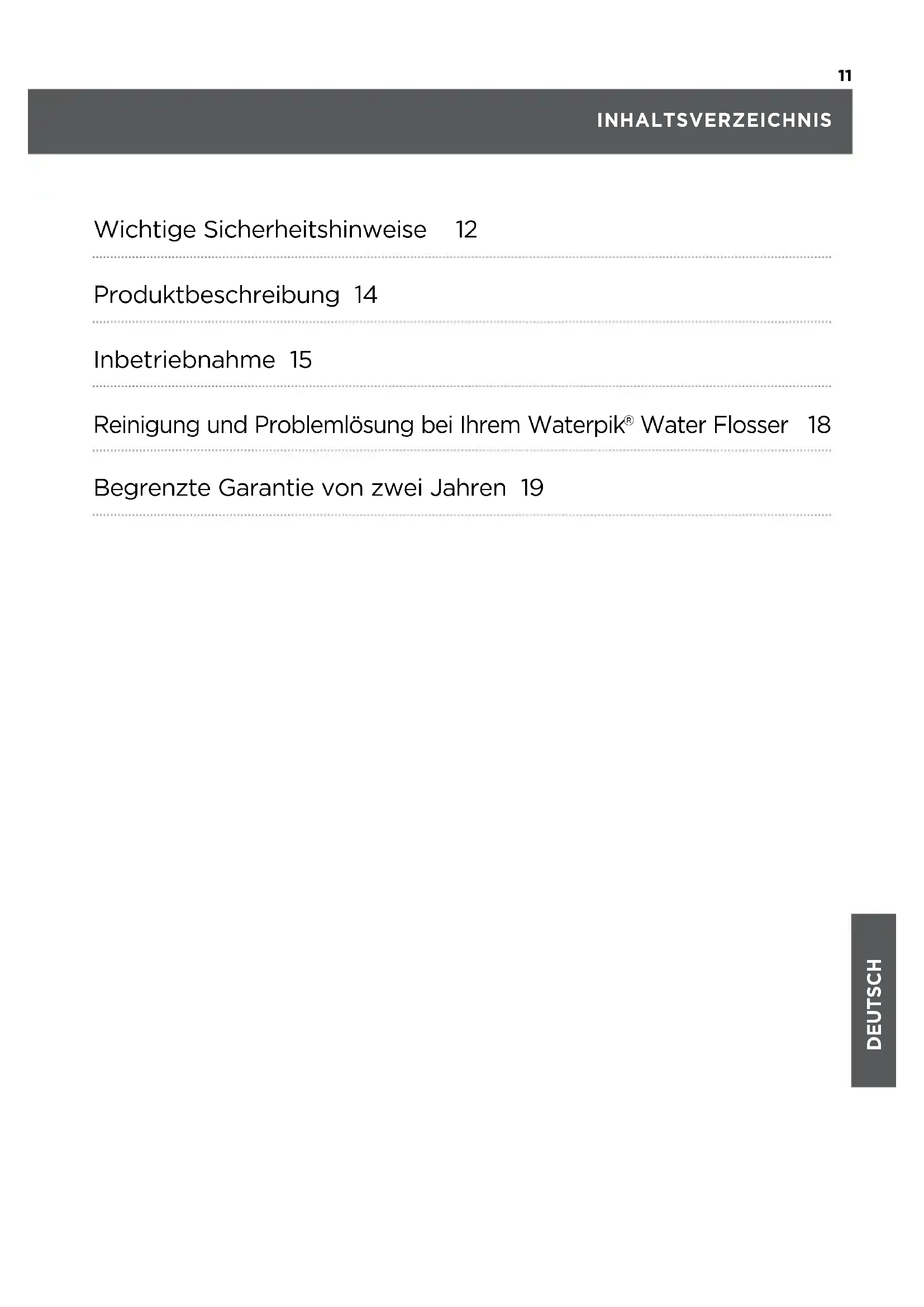 Water Pik, Inc. garantiert dem Originalkäufer/ Besitzer theses Produkts, dass das Produkt für zwei Jahre ab Kaufdatum frei von Material- und Verarbeitungsfehlern ist.itte haben Sie ihre Quittung/Rechnung als Nachweis des Kaufdatumsauf.Water Pik, Inc. behalt sich das Recht vor, vom reklamierenden Kunden zu verlangen, das Produkt fur die Analyse zurückzusenden, damit wir bestätigkeiten konnen, dass die angegebenen Mangel durch unsere Garantiebestimmungen gedeckt sind. Wir werden jedem Teil des Produkts ersetzen,das unserer Meinung nach fehlerhaft ist, sofern das Produkt nicht falsch angewendet, missbrauchlich verwendet, verändert, oder nach dem Kauf beschädigt wurde und wenn es entsprechend dieser Anleitung verwendet wurde. Reparatur oder Ersatzleistungen fur die Garantie werden von ortlichen Handlern ausgefuhrt, deren Kontaktdaten auf www.waterpik.com/intl gefunden werden konnen. These Garantie schlieBt Zubehor oder VerschleiBteile, wie Aufsätze, Bürstenköpe, usw. aus.