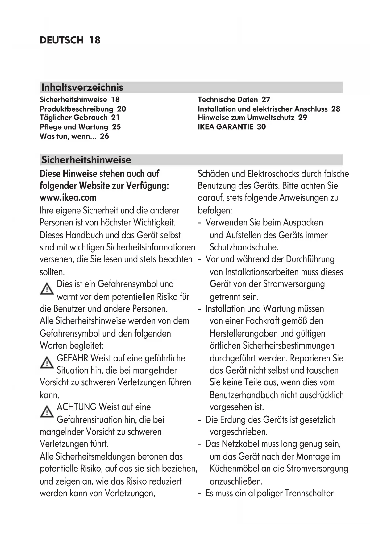 - ask for clarication on functions of IKEA appliances. To ensure that we provide you with the best assistance, please read carefully the Assembly Instructions and/or the User Manual before contacting us. How to reach us if you need our service Please refer to the last page of this manual for the full list of IKEA appointed Authorized Service Centre and relative national phone numbers. In order to provide you a quicker service, we recommend to use the specic phone numbers listed on this manual. Always refer to the numbers listed in the booklet of the specic appliance you need an assistance for. Please also always refer to the IKEA article number (8 digit code) and 12 digit service number placed on the rating plate of your appliance. SAVE THE SALES RECEIPT! It is your proof of purchase and required for the guarantee to apply. The sales receipt also reports the IKEA name and article number (8 digit code) for each of the appliances you have purchased. Do you need extra help? For any additional questions not related to After Sales of your appliances please contact your nearest IKEA store call centre. We recommend you read the appliance documentation carefully before contacting us.DEUTSCH 18 Diese Hinweise stehen auch auf folgender Website zur Verfügung: www.ikea.com Ihre eigene Sicherheit und die anderer Personen ist von höchster Wichtigkeit. Dieses Handbuch und das Gerät selbst sind mit wichtigen Sicherheitsinformationen versehen, die Sie lesen und stets beachten sollten. Dies ist ein Gefahrensymbol und warnt vor dem potentiellen Risiko für die Benutzer und andere Personen. Alle Sicherheitshinweise werden von dem Gefahrensymbol und den folgenden Worten begleitet: GEFAHR Weist auf eine gefährliche Situation hin, die bei mangelnder Vorsicht zu schweren Verletzungen führen kann. ACHTUNG Weist auf eine Gefahrensituation hin, die bei mangelnder Vorsicht zu schweren Verletzungen führt. Alle Sicherheitsmeldungen betonen das potentielle Risiko, auf das sie sich beziehen, und zeigen an, wie das Risiko reduziert werden kann von Verletzungen, Schäden und Elektroschocks durch falsche Benutzung des Geräts. Bitte achten Sie darauf, stets folgende Anweisungen zu befolgen: - Verwenden Sie beim Auspacken und Aufstellen des Geräts immer Schutzhandschuhe. - Vor und während der Durchführung von Installationsarbeiten muss dieses Gerät von der Stromversorgung getrennt sein. - Installation und Wartung müssen von einer Fachkraft gemäß den Herstellerangaben und gültigen örtlichen Sicherheitsbestimmungen durchgeführt werden. Reparieren Sie das Gerät nicht selbst und tauschen Sie keine Teile aus, wenn dies vom Benutzerhandbuch nicht ausdrücklich vorgesehen ist. - Die Erdung des Geräts ist gesetzlich vorgeschrieben. - Das Netzkabel muss lang genug sein, um das Gerät nach der Montage im Küchenmöbel an die Stromversorgung anzuschließen. - Es muss ein allpoliger Trennschalter Sicherheitshinweise 18 Produktbeschreibung 20 Täglicher Gebrauch 21 Pege und Wartung 25 Was tun, wenn... 26 Technische Daten 27 Installation und elektrischer Anschluss 28 Hinweise zum Umweltschutz 29 IKEA GARANTIE 30 Sicherheitshinweise InhaltsverzeichnisDEUTSCH 19 mit einer Mindestkontaktöffnung von 3 mm auf der fest verlegten Netzleitung installiert sein, damit diese den geltenden Sicherheitsbestimmungen entspricht. - Verwenden Sie keine Mehrfachsteckdosen und keine Verlängerungskabel. - Ziehen Sie nicht am Netzkabel des Geräts. - Nach der Installation dürfen Strom führende Teile für den Benutzer nicht mehr zugänglich sein. - Dieses Gerät ist ausschließlich zur Zubereitung von Nahrungsmitteln für private Haushalte konzipiert. Jeder hiervon abweichende Gebrauch (z. B. das Heizen von Räumen) ist nicht gestattet. Der Hersteller haftet nicht bei Schäden aufgrund eines unsachgemäßen Gebrauchs oder einer fehlerhaften Bedienung. - Das Gerät und die zugänglichen Teile werden bei der Benutzung heiß. Vermeiden Sie unbedingt das Berühren der Heizelemente. Achten Sie darauf, dass sich Kleinkinder (0-3 Jahre) und Kinder (3-8 Jahre) ohne Aufsicht nicht in der Nähe des Gerätes aufhalten. Dieses Gerät darf von Kindern über 8 Jahren und Personen, deren physische, sensorische oder geistige Fähigkeiten oder deren Mangel an Erfahrung und Kenntnissen einen sicheren Gebrauch des Gerätes ausschließen nur unter Aufsicht oder nach ausreichender Einweisung durch eine verantwortungsbewusste Person benutzt werden, die sicherstellt, dass sie sich der Gefahren des Gebrauchs bewusst sind. Kinder dürfen nicht an dem Gerät herum spielen. Die Reinigung und Pege des Gerätes darf von Kindern nicht ohne Aufsicht durchgeführt werden. - Berühren Sie die Heizelemente des Gerät nicht während und nach der Benutzung. Vermeiden Sie den Kontakt mit Tüchern oder anderen entammbaren Materialien, solange das Gerät nicht vollständig abgekühlt ist. - Legen Sie keine brennbaren Gegenstände auf oder in die Nähe des Geräts. - Heißes Fett und Öl sind leicht entzündlich. Beaufsichtigen Sie stets das Garen, und besonders dann, wenn Sie Speisen mit viel Fett oder Öl zubereiten. - Unter dem Gerät muss eine Trennplatte (nicht im Lieferumfang enthalten) installiert werden. - Weist die Oberäche Risse auf, schalten Sie das Gerät aus, um die Gefahr eines Stromschlags zu vermeiden (nur zutreffend für Kochfelder mit Glasoberäche).DEUTSCH 20 Produktbeschreibung