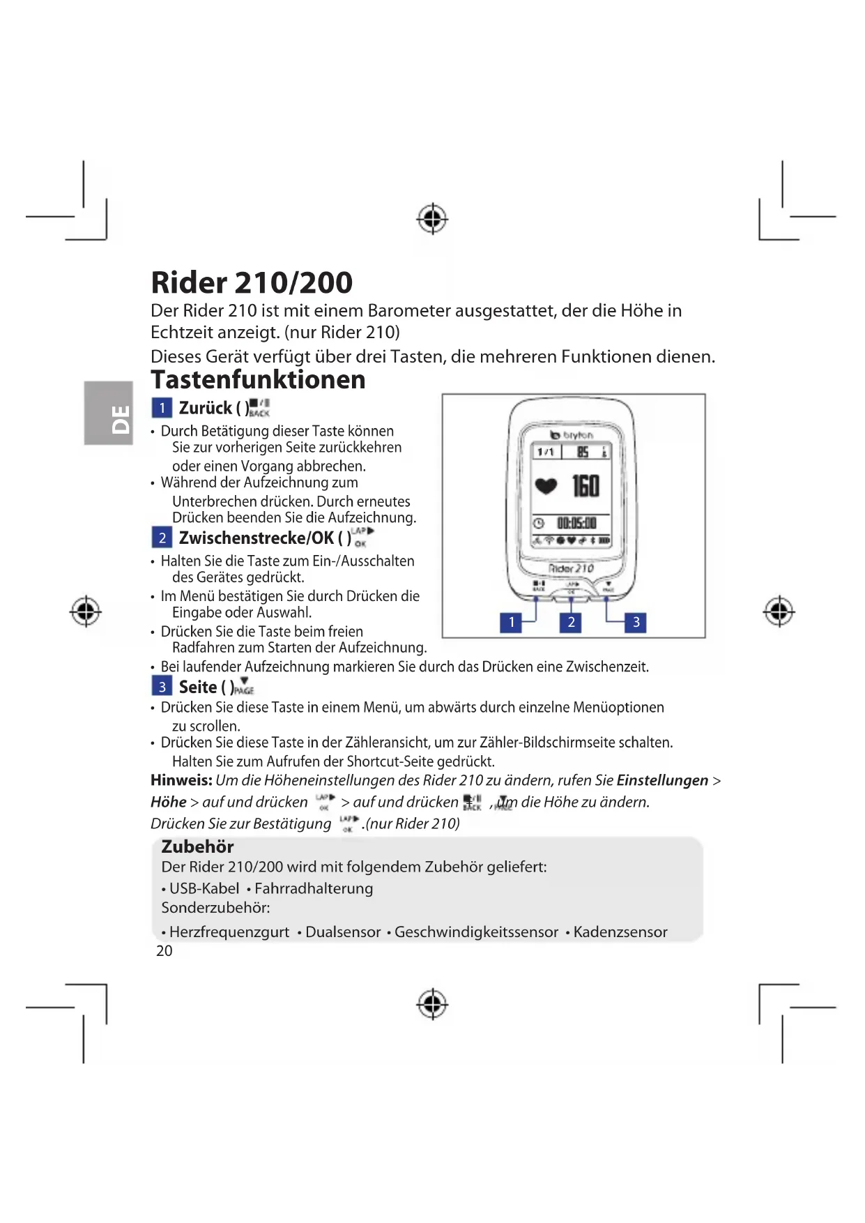 Seite ( ) t Drücken Sie diese Taste in einem Menü, um abwärts durch einzelne Menüoptionen zu scrollen. t Drücken Sie diese Taste in der Zähleransicht, um zur Zähler-Bildschirmseite schalten. Halten Sie zum Aufrufen der Shortcut-Seite gedrückt. Zubehör Der Rider 210/200 wird mit folgendem Zubehör geliefert: t64B-Kabel tFahrradhalterung Sonderzubehör: t)Frzfrequenzgurt tDualsensor tGeschwindigkeitssensor tKadenzsensor