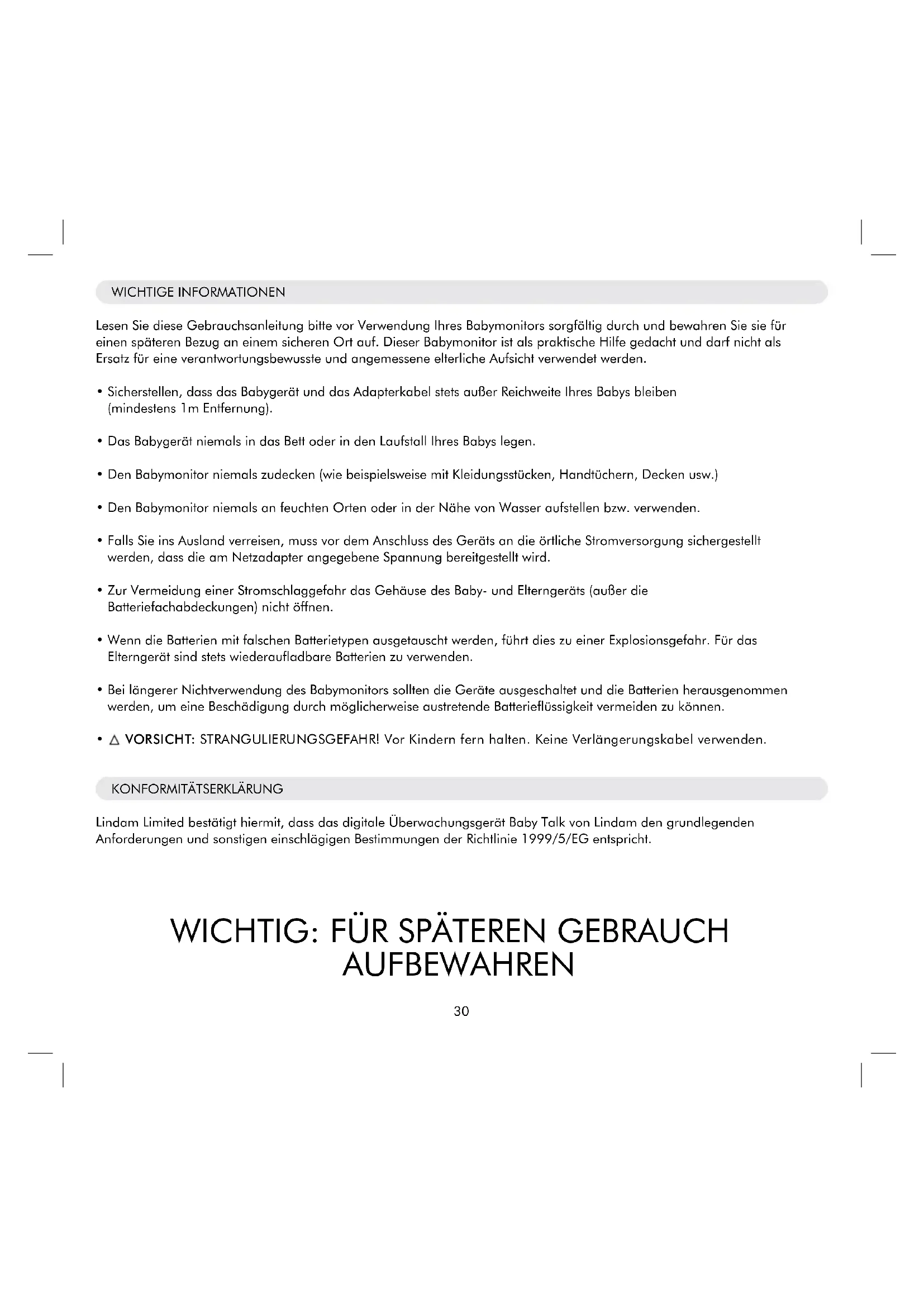 Lesen Sie diese Gebrauchsanleitungitte vor Verwendung Ihres Babymonitors sorgfaltig durch und bewahren Sie sie fur einen spateren Bezug an einem sicheren Ort auf. Dieser Babymonitor ist als praktische Hilfe gedacht und darft nicht als Ersatz fur eine verantwortungsbewusste und angemessene alterliche Aufsicht verwendet werden.