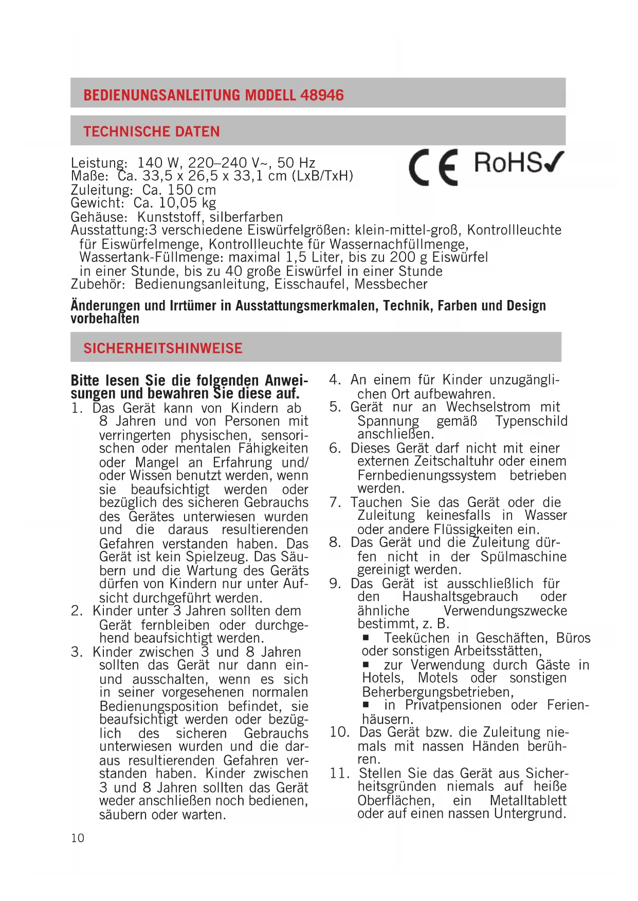 BEDIENUNGSANLEITUNG MODELL 48946 SICHERHEITSHINWEISE TECHNISCHE DATEN Bitte lesen Sie die folgenden Anwei- sungen und bewahren Sie diese auf.
