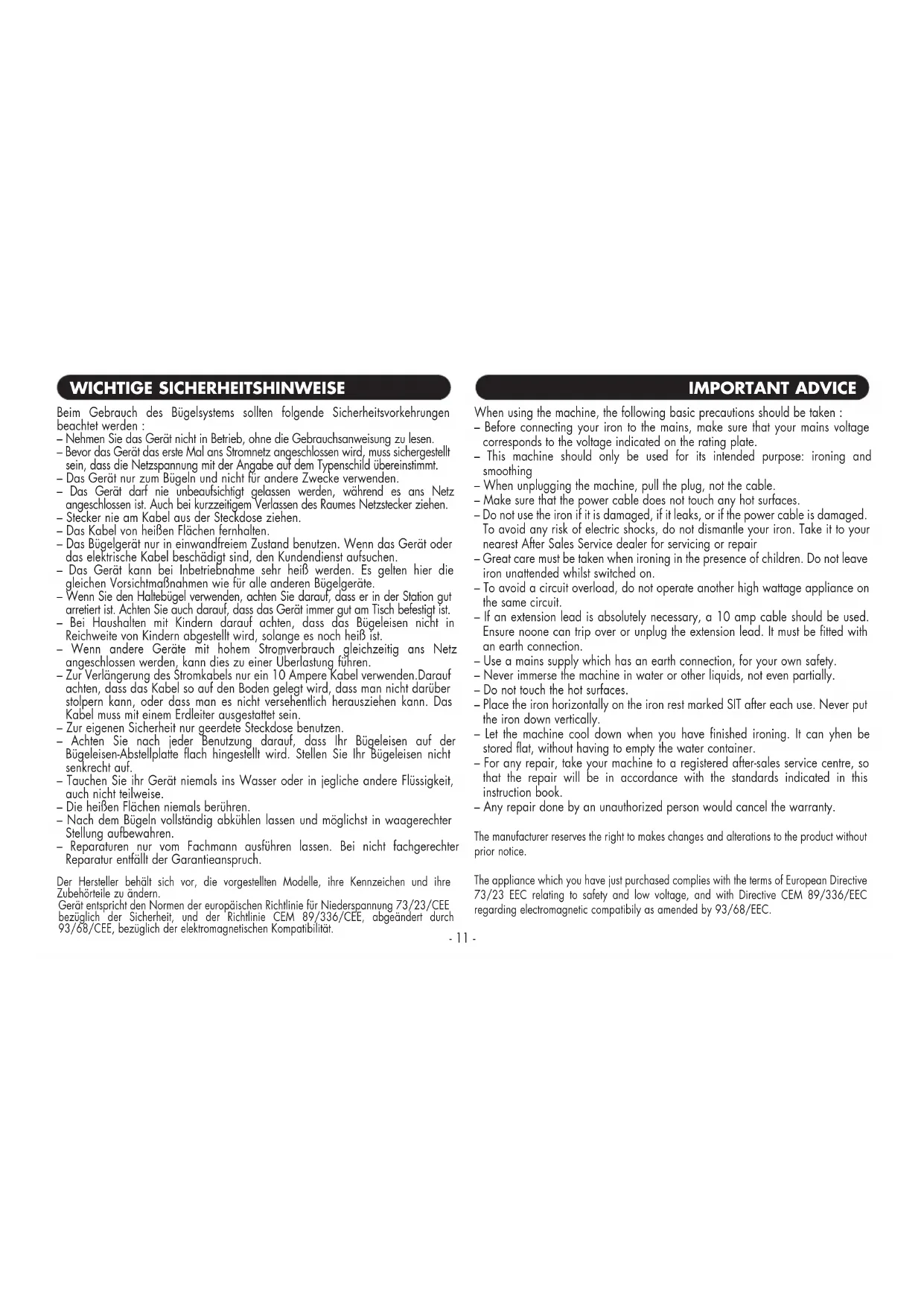 - If you lie the machine on its side, water from the container may spill out. STORAGEDie Bügeleisensohle kann durch Waschmittelrückstände, durch die Appretur der Stoffe und Fasern verunreinigt werden und gleitet dann nicht mehr leicht über den Stoff. Deshalb Bügeleisen nach dem Bügeln mit einem nichtflusenden Lappen abreiben. Schwer zu entfernende Flecken und Ablagerungen sollten mit einem Bügeleisen-Reinigerstift behandelt werden. Auf keinen Fall alkalihaltige Produkte (z.B. Backofenreiniger), scharfe Reinigungs- mittel, Scheuermittel oder Stahlwolle verwenden.