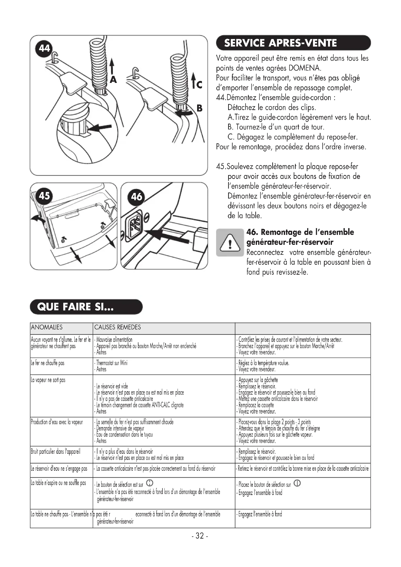 unit Reconnect by pushing the whole unit firmly in at the bottom and putting the screws back in. AFTER-SALES SERVICE Grundsätzlich ist der Händler, bei dem Sie dieses Gerät erworben haben, Ihr erster Ansprechpartner. Darüber hinaus stehen Ihnen diverse autorisierte DOMENA Service-Partner zur Verfügung. Eine entsprechende Liste dazu finden Sie auf der DOMENA-Homepage unter HYPERLINK "http://www.domena-gmbh.de" oder unter Tel. 0721/9333941 bzw. Fax 0721/9332942. Da das Dampfbügelsytem aus zwei separaten Einheiten (Bügeltisch bzw. Dampfstation) besteht, muss nur die jeweilige Einheit zum Händler gebracht werden. Trennen der Dampfstation vom Bügeltisch:
