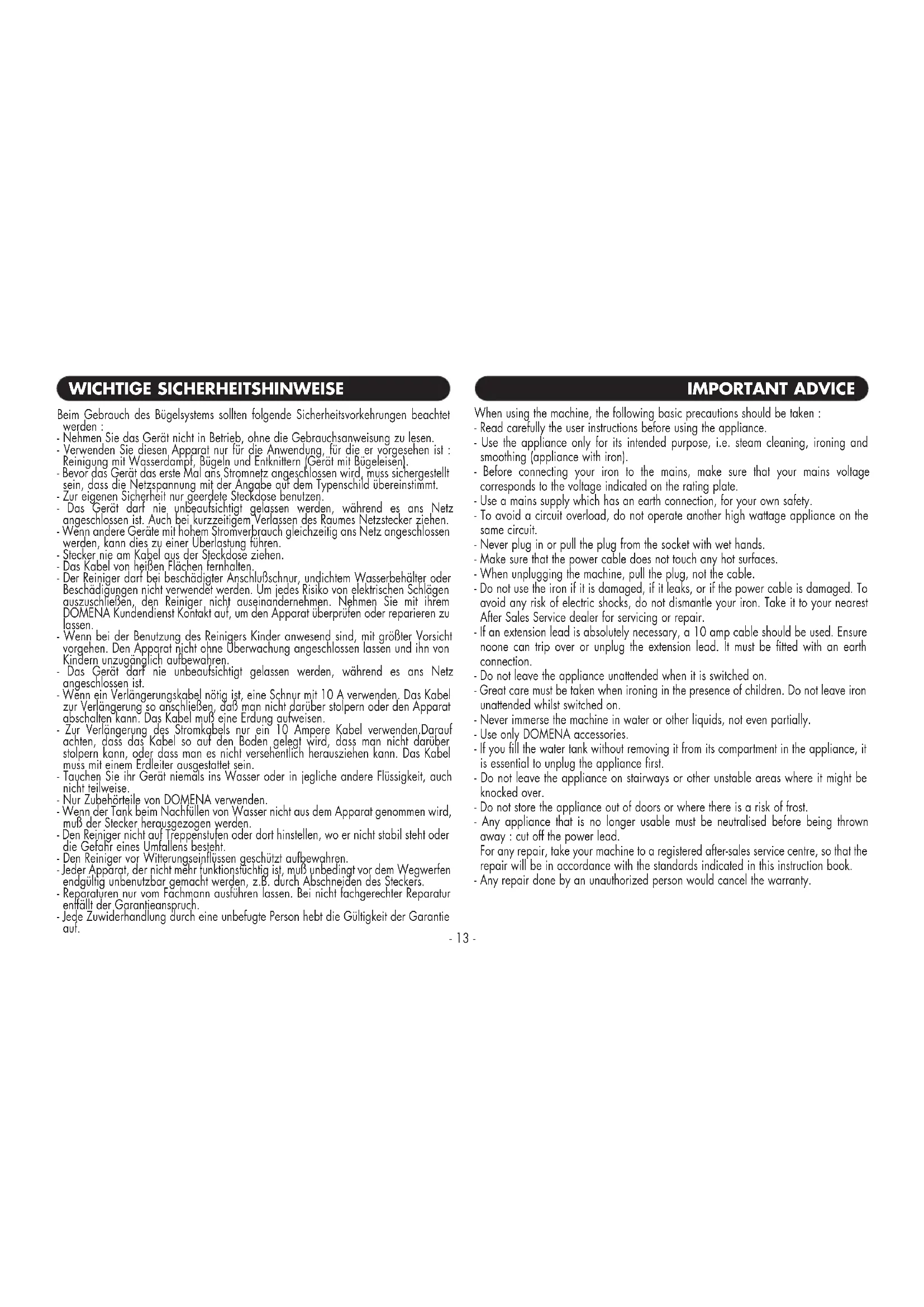 - Gebruik voor het reinigen van de buitenkant van het apparaat alleen een vochtige doek. Vermijd oplosmiddelen of reinigingsmiddelen die het plastic oppervlak kunnen beschadigen.- 13 - Beim Gebrauch des Bügelsystems sollten folgende Sicherheitsvorkehrungen beachtet werden : - Nehmen Sie das Gerät nicht in Betrieb, ohne die Gebrauchsanweisung zu lesen. - Verwenden Sie diesen Apparat nur für die Anwendung, für die er vorgesehen ist : Reinigung mit Wasserdampf, Bügeln und Entknittern (Gerät mit Bügeleisen). - Bevor das Gerät das erste Mal ans Stromnetz angeschlossen wird, muss sichergestellt sein, dass die Netzspannung mit der Angabe auf dem Typenschild übereinstimmt. - Zur eigenen Sicherheit nur geerdete Steckdose benutzen. - Das Gerät darf nie unbeaufsichtigt gelassen werden, während es ans Netz angeschlossen ist. Auch bei kurzzeitigem Verlassen des Raumes Netzstecker ziehen. - Wenn andere Geräte mit hohem Stromverbrauch gleichzeitig ans Netz angeschlossen werden, kann dies zu einer Überlastung führen. - Stecker nie am Kabel aus der Steckdose ziehen. - Das Kabel von heißen Flächen fernhalten. - Der Reiniger darf bei beschädigter Anschlußschnur, undichtem Wasserbehälter oder Beschädigungen nicht verwendet werden. Um jedes Risiko von elektrischen Schlägen auszuschließen, den Reiniger nicht auseinandernehmen. Nehmen Sie mit ihrem DOMENA Kundendienst Kontakt auf, um den Apparat überprüfen oder reparieren zu lassen. - Wenn bei der Benutzung des Reinigers Kinder anwesend sind, mit größter Vorsicht vorgehen. Den Apparat nicht ohne Überwachung angeschlossen lassen und ihn von Kindern unzugänglich aufbewahren. - Das Gerät darf nie unbeaufsichtigt gelassen werden, während es ans Netz angeschlossen ist. - Wenn ein Verlängerungskabel nötig ist, eine Schnur mit 10 A verwenden. Das Kabel zur Verlängerung so anschließen, daß man nicht darüber stolpern oder den Apparat abschalten kann. Das Kabel muß eine Erdung aufweisen. - Zur Verlängerung des Stromkabels nur ein 10 Ampere Kabel verwenden.Darauf achten, dass das Kabel so auf den Boden gelegt wird, dass man nicht darüber stolpern kann, oder dass man es nicht versehentlich herausziehen kann. Das Kabel muss mit einem Erdleiter ausgestattet sein. - Tauchen Sie ihr Gerät niemals ins Wasser oder in jegliche andere Flüssigkeit, auch nicht teilweise. - Nur Zubehörteile von DOMENA verwenden. - Wenn der Tank beim Nachfüllen von Wasser nicht aus dem Apparat genommen wird, muß der Stecker herausgezogen werden. - Den Reiniger nicht auf Treppenstufen oder dort hinstellen, wo er nicht stabil steht oder die Gefahr eines Umfallens besteht. - Den Reiniger vor Witterungseinflüssen geschützt aufbewahren. - Jeder Apparat, der nicht mehr funktionstüchtig ist, muß unbedingt vor dem Wegwerfen endgültig unbenutzbar gemacht werden, z.B. durch Abschneiden des Steckers. - Reparaturen nur vom Fachmann ausführen lassen. Bei nicht fachgerechter Reparatur entfällt der Garantieanspruch. - Jede Zuwiderhandlung durch eine unbefugte Person hebt die Gültigkeit der Garantie auf. WICHTIGE SICHERHEITSHINWEISE When using the machine, the following basic precautions should be taken : - Read carefully the user instructions before using the appliance. - Use the appliance only for its intended purpose, i.e. steam cleaning, ironing and smoothing (appliance with iron). - Before connecting your iron to the mains, make sure that your mains voltage corresponds to the voltage indicated on the rating plate. - Use a mains supply which has an earth connection, for your own safety. - To avoid a circuit overload, do not operate another high wattage appliance on the same circuit. - Never plug in or pull the plug from the socket with wet hands. - Make sure that the power cable does not touch any hot surfaces. - When unplugging the machine, pull the plug, not the cable. - Do not use the iron if it is damaged, if it leaks, or if the power cable is damaged. To avoid any risk of electric shocks, do not dismantle your iron. Take it to your nearest After Sales Service dealer for servicing or repair. - If an extension lead is absolutely necessary, a 10 amp cable should be used. Ensure noone can trip over or unplug the extension lead. It must be fitted with an earth connection. - Do not leave the appliance unattended when it is switched on. - Great care must be taken when ironing in the presence of children. Do not leave iron unattended whilst switched on. - Never immerse the machine in water or other liquids, not even partially. - Use only DOMENA accessories. - If you fill the water tank without removing it from its compartment in the appliance, it is essential to unplug the appliance first. - Do not leave the appliance on stairways or other unstable areas where it might be knocked over. - Do not store the appliance out of doors or where there is a risk of frost. - Any appliance that is no longer usable must be neutralised before being thrown away : cut off the power lead. For any repair, take your machine to a registered after-sales service centre, so that the repair will be in accordance with the standards indicated in this instruction book. - Any repair done by an unauthorized person would cancel the warranty. IMPORTANT ADVICE- 14 - - Nie bei leerem Wasserbehälter die Dampftaste betätigen da dies zur Beschädigung der Pumpe führen kann. - Nie dem Wasser Zusatzstoffe auf Alkoholbasis oder Parfumextrakte, Kölnisch Wasser usw. zufügen, auch keine Reinigungsprodukte oder Fleckenentferner. - Den Dampfstrahl nicht auf Tiere oder Menschen richten. Der ausströmende Wasserdampf ist sehr heiß und kann zu schweren Verbrennungen führen. - Den Dampfstrahl nicht auf elektrische Anschlüsse, Installationen und Geräte richten, auch nicht auf den Reiniger. - Wechseln Sie das Zubehör während der Dampfabgabe nicht aus. WICHTIGE HINWEISE