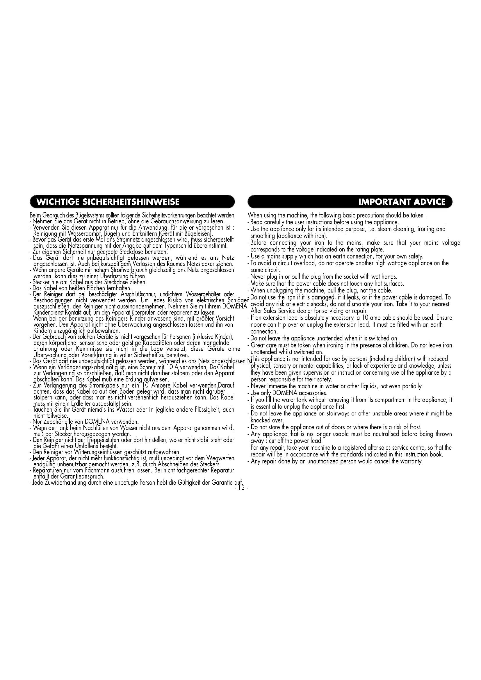 - Gebruik voor het reinigen van de buitenkant van het apparaat alleen een vochtige doek. Vermijd oplosmiddelen of reinigingsmiddelen die het plastic oppervlak kunnen beschadigen.- 13 - Beim Gebrauch des Bügelsystems sollten folgende Sicherh e i t s v o r k e h rungen beachtet werden - Nehmen Sie das Gerät nicht in Betrieb, ohne die Gebrauchsanweisung zu lesen. - Verwenden Sie diesen Apparat nur für die Anwendung, für die er vorgesehen ist : Reinigung mit Wasserdampf, Bügeln und Entknittern (Gerät mit Bügeleisen). - Bevor das Gerät das erste Mal ans Stromnetz angeschlossen wird, muss sichergestellt sein, dass die Netzspannung mit der Angabe auf dem Typenschild übereinstimmt. - Zur eigenen Sicherheit nur geerdete Steckdose benutzen. - Das Gerät darf nie unbeaufsichtigt gelassen werden, während es ans Netz angeschlossen ist. Auch bei kurzzeitigem Verlassen des Raumes Netzstecker ziehen. - Wenn andere Geräte mit hohem Stromverbrauch gleichzeitig ans Netz angeschlossen werden, kann dies zu einer Überlastung führen. - Stecker nie am Kabel aus der Steckdose ziehen. - Das Kabel von heißen Flächen fernhalten. - Der Reiniger darf bei beschädigter Anschlußschnur, undichtem Wasserbehälter oder Beschädigungen nicht verwendet werden. Um jedes Risiko von elektrischen Schlägen auszuschließen, den Reiniger nicht auseinandernehmen. Nehmen Sie mit ihrem DOMENA Kundendienst Kontakt auf, um den Apparat überprüfen oder re p a r i e r en zu lassen. - Wenn bei der Benutzung des Reinigers Kinder anwesend sind, mit größter Vorsicht vorgehen. Den Apparat nicht ohne Überwachung angeschlossen lassen und ihn von Kindern unzugänglich aufbewahren. - Der Gebrauch von solchen Geräte ist nicht vorgesehen für Personen (inklusive Kinder), deren körperliche, sensorische oder geistige Kapazitäten oder deren mangelnde Erfahrung oder Kenntnisse sie nicht in die Lage versetzt, diese Geräte ohne Überwachung oder Vorerklärung in voller Sicherheit zu benutzen. - Das Gerät darf nie unbeaufsichtigt gelassen werden, während es ans Netz angeschlossen ist. - Wenn ein Verlängerungskabel nötig ist, eine Schnur mit 10 A verwenden. Das Kabel zur Verlängerung so anschließen, daß man nicht darüber stolpern oder den Apparat abschalten kann. Das Kabel muß eine Erdung aufweisen. - Zur Verlängerung des Stromkabels nur ein 10 Ampere Kabel verwenden.Darauf achten, dass das Kabel so auf den Boden gelegt wird, dass man nicht darüber stolpern kann, oder dass man es nicht versehentlich herausziehen kann. Das Kabel muss mit einem Erdleiter ausgestattet sein. - Tauchen Sie ihr Gerät niemals ins Wasser oder in jegliche andere Flüssigkeit, auch nicht teilweise. - Nur Zubehörteile von DOMENA verwenden. - Wenn der Tank beim Nachfüllen von Wasser nicht aus dem Apparat genommen wird, muß der Stecker herausgezogen werden. - Den Reiniger nicht auf Treppenstufen oder dort hinstellen, wo er nicht stabil steht oder die Gefahr eines Umfallens besteht. - Den Reiniger vor Witterungseinflüssen geschützt aufbewahren. - Jeder Apparat, der nicht mehr funktionstüchtig ist, muß unbedingt vor dem Wegwerfen endgültig unbenutzbar gemacht werden, z.B. durch Abschneiden des Steckers. - Reparaturen nur vom Fachmann ausführen lassen. Bei nicht fachgerechter Reparatur entfällt der Garantieanspruch. - Jede Zuwiderhandlung durch eine unbefugte Person hebt die Gültigkeit der Garantie auf. WICHTIGE SICHERHEITSHINWEISE When using the machine, the following basic precautions should be taken : - Read carefully the user instructions before using the appliance. - Use the appliance only for its intended purpose, i.e. steam cleaning, ironing and smoothing (appliance with iron). - Before connecting your iron to the mains, make sure that your mains voltage corresponds to the voltage indicated on the rating plate. - Use a mains supply which has an earth connection, for your own safety. - To avoid a circuit overload, do not operate another high wattage appliance on the same circuit. - Never plug in or pull the plug from the socket with wet hands. - Make sure that the power cable does not touch any hot surfaces. - When unplugging the machine, pull the plug, not the cable. - Do not use the iron if it is damaged, if it leaks, or if the power cable is damaged. To avoid any risk of electric shocks, do not dismantle your iron. Take it to your nearest After Sales Service dealer for servicing or repair. - If an extension lead is absolutely necessary, a 10 amp cable should be used. Ensure noone can trip over or unplug the extension lead. It must be fitted with an earth connection. - Do not leave the appliance unattended when it is switched on. - Great care must be taken when ironing in the presence of children. Do not leave iron unattended whilst switched on. - This appliance is not intended for use by persons (including children) with reduced physical, sensory or mental capabilities, or lack of experience and knowledge, unless they have been given supervision or instruction concerning use of the appliance by a person responsible for their safety. - Never immerse the machine in water or other liquids, not even partially. - Use only DOMENA accessories. - If you fill the water tank without removing it from its compartment in the appliance, it is essential to unplug the appliance first. - Do not leave the appliance on stairways or other unstable areas where it might be knocked over. - Do not store the appliance out of doors or where there is a risk of frost. - Any appliance that is no longer usable must be neutralised before being thrown away : cut off the power lead. For any repair, take your machine to a registered after-sales service centre, so that the repair will be in accordance with the standards indicated in this instruction book. - Any repair done by an unauthorized person would cancel the warranty. IMPORTANT ADVICE- 14 - - Nie bei leerem Wasserbehälter die Dampftaste betätigen da dies zur Beschädigung der Pumpe führen kann. - Nie dem Wa