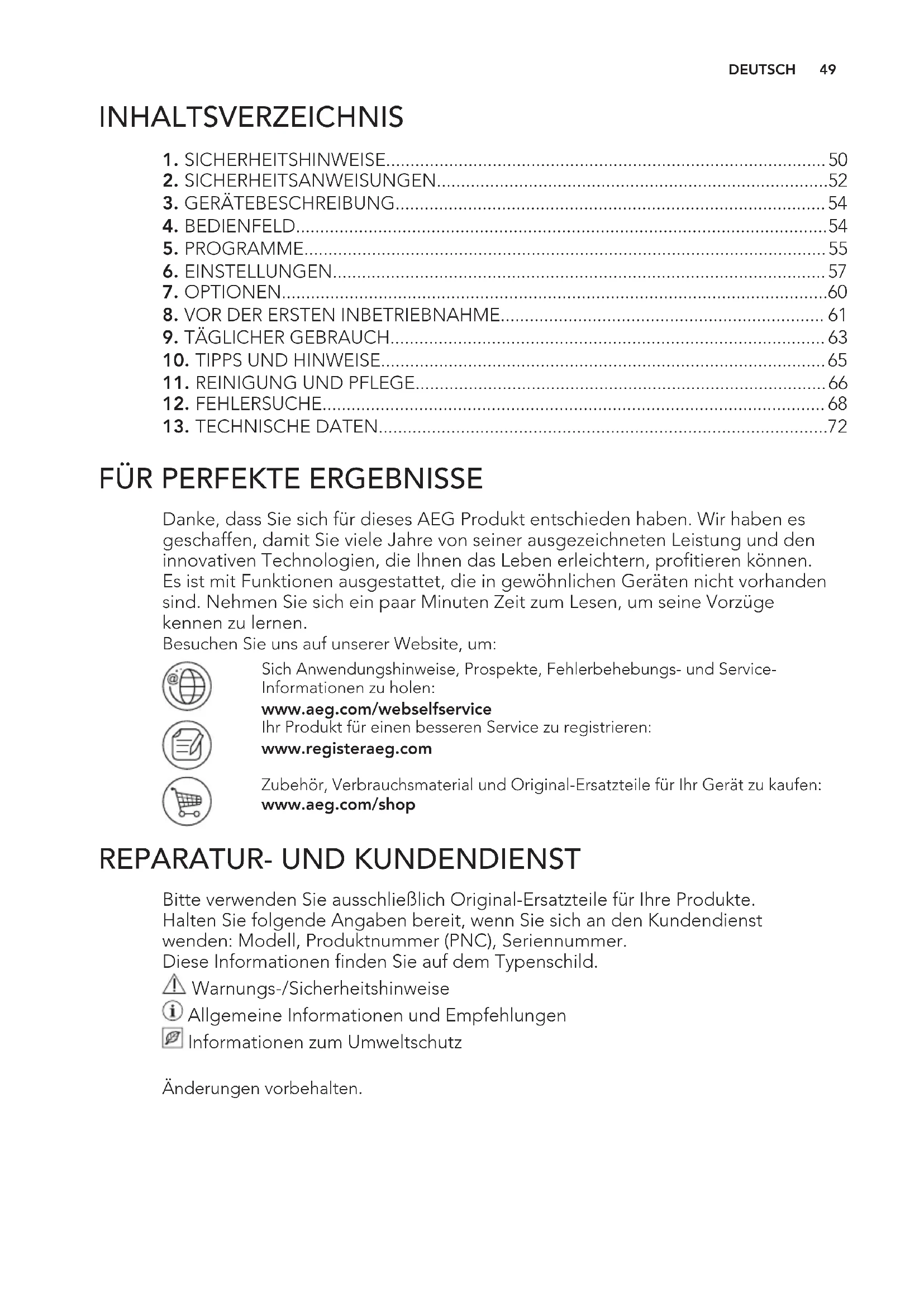 Bitte verwenden Sie ausschließlich Original-Ersatzteile für Ihre Produkte. Halten Sie folgende Angaben bereit, wenn Sie sich an den Kundendienst wenden: Modell, Produktnummer (PNC), Seriennummer. Diese Informationen finden Sie auf dem Typenschild. Warnungs-/Sicherheitshinweise Allgemeine Informationen und Empfehlungen Informationen zum Umweltschutz Änderungen vorbehalten. DEUTSCH