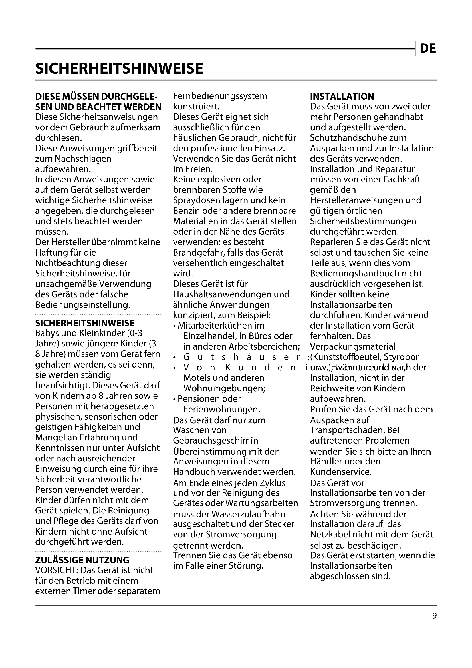 VORSICHT: Das Gerät ist nicht für den Betrieb mit einem externen Timer oder separatem Fernbedienungssystem konstruiert. Dieses Gerät eignet sich ausschließlich für den häuslichen Gebrauch, nicht für den professionellen Einsatz. Verwenden Sie das Gerät nicht im Freien. Keine explosiven oder brennbaren Stoffe wie Spraydosen lagern und kein Benzin oder andere brennbare Materialien in das Gerät stellen oder in der Nähe des Geräts verwenden: es besteht Brandgefahr, falls das Gerät versehentlich eingeschaltet wird. Dieses Gerät ist für Haushaltsanwendungen und ähnliche Anwendungen konzipiert, zum Beispiel: