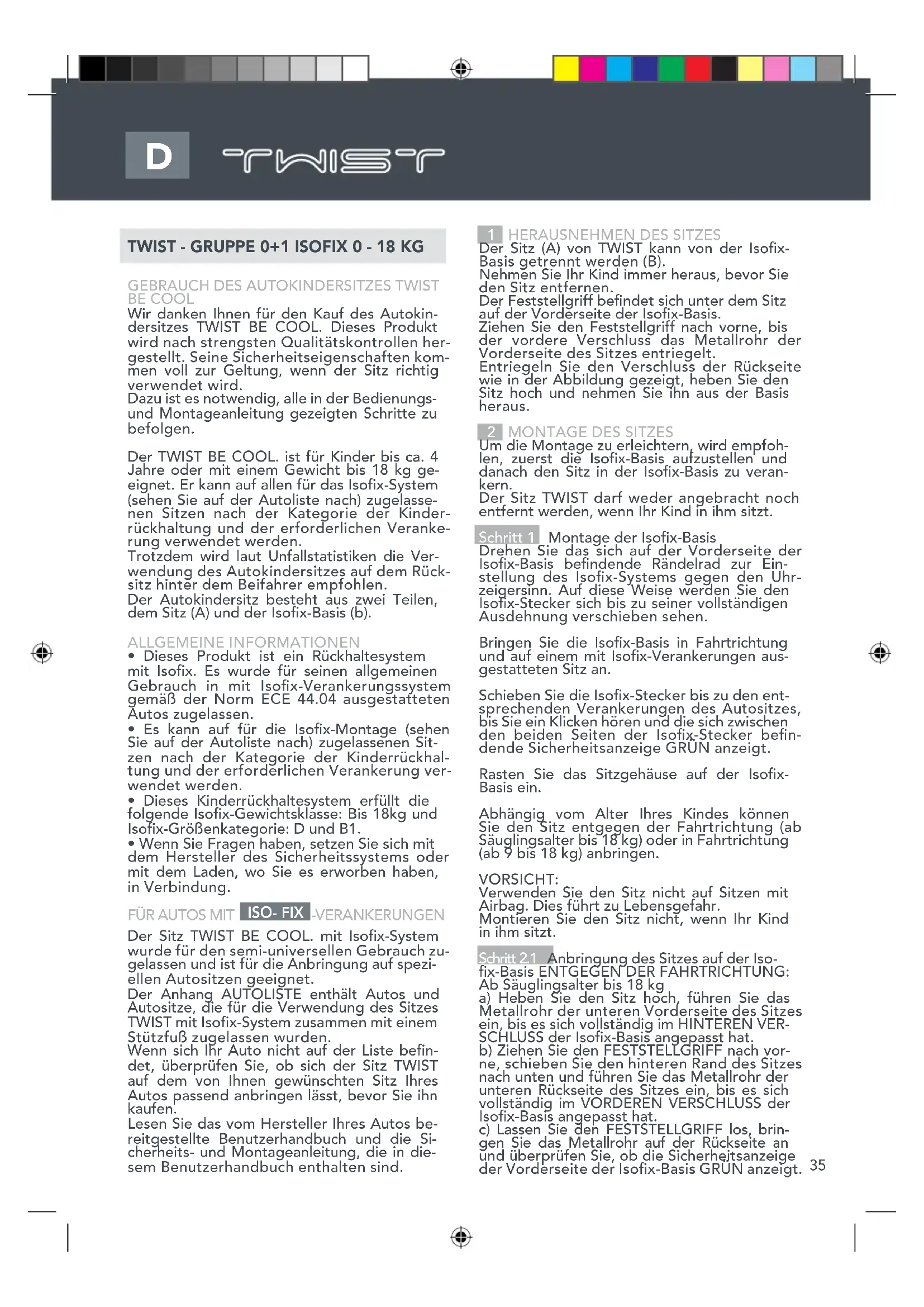 Wir danken Ihnen für den Kauf des Autokindersitzes TWIST BE COOL. Dieses Produkt wird nach strengsten Qualitätskontrollen hergestellt. Seine Sicherheitseigenschaftenkommen voll zur Geltung, wenn der Sitz richtig verwendet wird. Dazu ist es notwendig, alle in der Bedienungs- und Montageanleitung gezeugten Schritte zu befolgen.