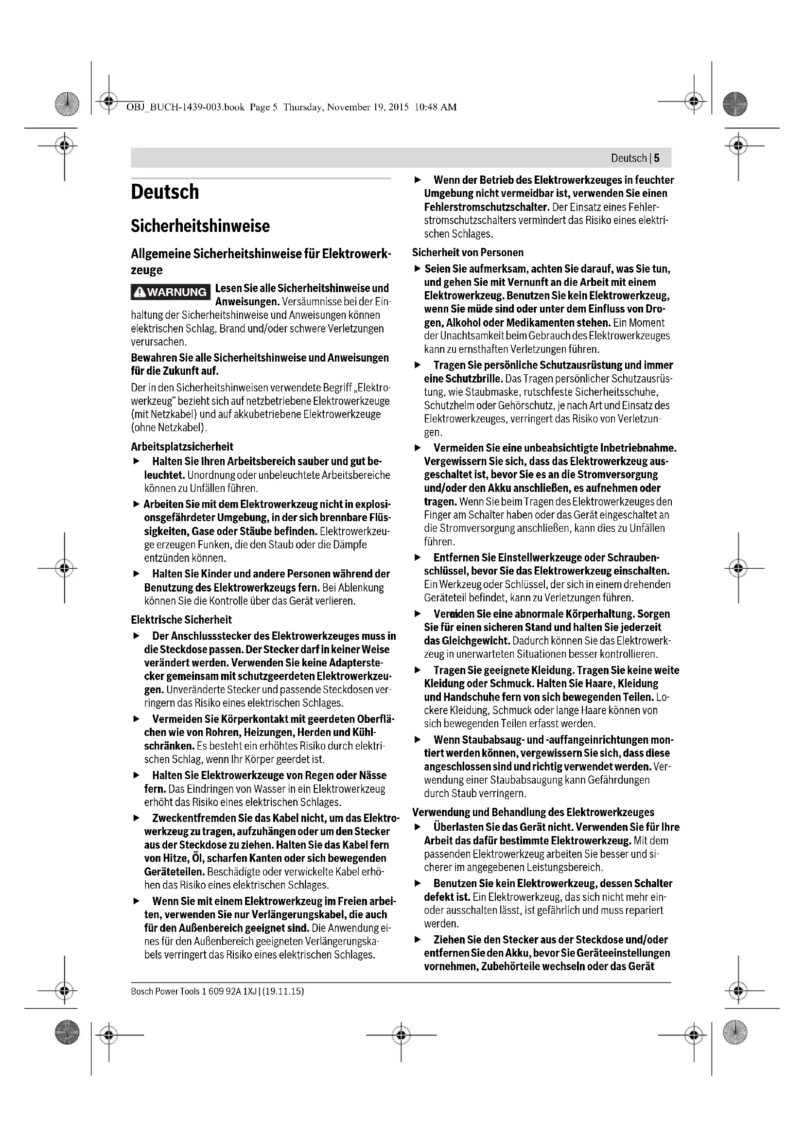 OBJ_BUCH-1439-003.book Page 4 Thursday, November 19, 2015 9:36 AMDeutsch | 5 Bosch Power Tools 1 609 92A 1XJ | (19.11.15) Deutsch Sicherheitshinweise Allgemeine Sicherheitshinweise für Elektrowerk- zeuge Lesen Sie alle Sicherheitshinweise und Anweisungen. Versäumnisse bei der Ein- haltung der Sicherheitshinweise und Anweisungen können elektrischen Schlag, Brand und/oder schwere Verletzungen verursachen. Bewahren Sie alle Sicherheitshinweise und Anweisungen für die Zukunft auf. Der in den Sicherheitshinweisen verwendete Begriff „Elektro- werkzeug“ bezieht sich auf netzbetriebene Elektrowerkzeuge (mit Netzkabel) und auf akkubetriebene Elektrowerkzeuge (ohne Netzkabel). Arbeitsplatzsicherheit Halten Sie Ihren Arbeitsbereich sauber und gut be- leuchtet. Unordnung oder unbeleuchtete Arbeitsbereiche können zu Unfällen führen. Arbeiten Sie mit dem Elektrowerkzeug nicht in explosi- onsgefährdeter Umgebung, in der sich brennbare Flüs- sigkeiten, Gase oder Stäube befinden. Elektrowerkzeu- ge erzeugen Funken, die den Staub oder die Dämpfe entzünden können. Halten Sie Kinder und andere Personen während der Benutzung des Elektrowerkzeugs fern. Bei Ablenkung können Sie die Kontrolle über das Gerät verlieren. Elektrische Sicherheit Der Anschlussstecker des Elektrowerkzeuges muss in die Steckdose passen. Der Stecker darf in keiner Weise verändert werden. Verwenden Sie keine Adapterste- cker gemeinsam mit schutzgeerdeten Elektrowerkzeu- gen. Unveränderte Stecker und passende Steckdosen ver- ringern das Risiko eines elektrischen Schlages. Vermeiden Sie Körperkontakt mit geerdeten Oberflä- chen wie von Rohren, Heizungen, Herden und Kühl- schränken. Es besteht ein erhöhtes Risiko durch elektri- schen Schlag, wenn Ihr Körper geerdet ist. Halten Sie Elektrowerkzeuge von Regen oder Nässe fern. Das Eindringen von Wasser in ein Elektrowerkzeug erhöht das Risiko eines elektrischen Schlages. Zweckentfremden Sie das Kabel nicht, um das Elektro- werkzeug zu tragen, aufzuhängen oder um den Stecker aus der Steckdose zu ziehen. Halten Sie das Kabel fern von Hitze, Öl, scharfen Kanten oder sich bewegenden Geräteteilen. Beschädigte oder verwickelte Kabel erhö- hen das Risiko eines elektrischen Schlages. Wenn Sie mit einem Elektrowerkzeug im Freien arbei- ten, verwenden Sie nur Verlängerungskabel, die auch für den Außenbereich geeignet sind. Die Anwendung ei- nes für den Außenbereich geeigneten Verlängerungska- bels verringert das Risiko eines elektrischen Schlages. Wenn der Betrieb des Elektrowerkzeuges in feuchter Umgebung nicht vermeidbar ist, verwenden Sie einen Fehlerstromschutzschalter. Der Einsatz eines Fehler- stromschutzschalters vermindert das Risiko eines elektri- schen Schlages. Sicherheit von Personen Seien Sie aufmerksam, achten Sie darauf, was Sie tun, und gehen Sie mit Vernunft an die Arbeit mit einem Elektrowerkzeug. Benutzen Sie kein Elektrowerkzeug, wenn Sie müde sind oder unter dem Einfluss von Dro- gen, Alkohol oder Medikamenten stehen. Ein Moment der Unachtsamkeit beim Gebrauch des Elektrowerkzeuges kann zu ernsthaften Verletzungen führen. Tragen Sie persönliche Schutzausrüstung und immer eine Schutzbrille. Das Tragen persönlicher Schutzausrüs- tung, wie Staubmaske, rutschfeste Sicherheitsschuhe, Schutzhelm oder Gehörschutz, je nach Art und Einsatz des Elektrowerkzeuges, verringert das Risiko von Verletzun- gen. Vermeiden Sie eine unbeabsichtigte Inbetriebnahme. Vergewissern Sie sich, dass das Elektrowerkzeug aus- geschaltet ist, bevor Sie es an die Stromversorgung und/oder den Akku anschließen, es aufnehmen oder tragen. Wenn Sie beim Tragen des Elektrowerkzeuges den Finger am Schalter haben oder das Gerät eingeschaltet an die Stromversorgung anschließen, kann dies zu Unfällen führen. Entfernen Sie Einstellwerkzeuge oder Schrauben- schlüssel, bevor Sie das Elektrowerkzeug einschalten. Ein Werkzeug oder Schlüssel, der sich in einem drehenden Geräteteil befindet, kann zu Verletzungen führen. Verm eiden Sie eine abnormale Körperhaltung. Sorgen Sie für einen sicheren Stand und halten Sie jederzeit das Gleichgewicht. Dadurch können Sie das Elektrowerk- zeug in unerwarteten Situationen besser kontrollieren. Tragen Sie geeignete Kleidung. Tragen Sie keine weite Kleidung oder Schmuck. Halten Sie Haare, Kleidung und Handschuhe fern von sich bewegenden Teilen. Lo- ckere Kleidung, Schmuck oder lange Haare können von sich bewegenden Teilen erfasst werden. Wenn Staubabsaug- und -auffangeinrichtungen mon- tiert werden können, vergewissern Sie sich, dass diese angeschlossen sind und richtig verwendet werden. Ver- wendung einer Staubabsaugung kann Gefährdungen durch Staub verringern. Verwendung und Behandlung des Elektrowerkzeuges Überlasten Sie das Gerät nicht. Verwenden Sie für Ihre Arbeit das dafür bestimmte Elektrowerkzeug. Mit dem passenden Elektrowerkzeug arbeiten Sie besser und si- cherer im angegebenen Leistungsbereich. Benutzen Sie kein Elektrowerkzeug, dessen Schalter defekt ist. Ein Elektrowerkzeug, das sich nicht mehr ein- oder ausschalten lässt, ist gefährlich und muss repariert werden. Ziehen Sie den Stecker aus der Steckdose und/oder entfernen Sie den Akku, bevor Sie Geräteeinstellungen vornehmen, Zubehörteile wechseln oder das Gerät WARNUNG OBJ_BUCH-1439-003.book Page 5 Thursday, November 19, 2015 10:48 AM6 | Deutsch 1 609 92A 1XJ | (19.11.15) Bosch Power Tools weglegen. Diese Vorsichtsmaßnahme verhindert den un- beabsichtigten Start des Elektrowerkzeuges. Bewahren Sie unbenutzte Elektrowerkzeuge außer- halb der Reichweite von Kindern auf. Lassen Sie Perso- nen das Gerät nicht benutzen, die mit diesem nicht ver- traut sind oder diese Anweisungen nicht gelesen haben. Elektrowerkzeuge sind gefährlich, wenn sie von unerfahrenen Personen benutzt werden. Pflegen Sie Elektrowerkzeuge mit Sorgfalt. Kontrollie- ren Sie, ob bewegliche Teile einwandfrei funktionieren und nicht klemmen, ob Teile gebrochen oder so be- schädigt sind, da