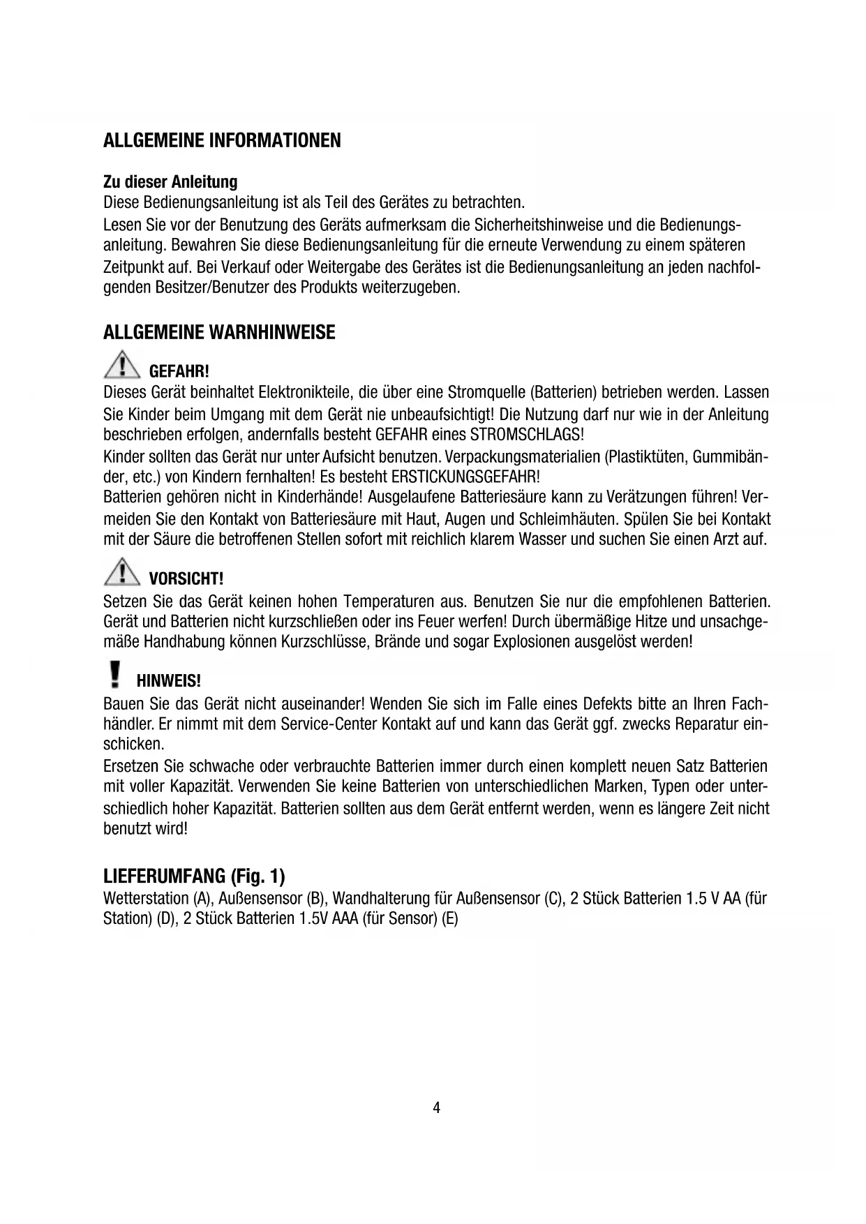 - Service og garanti Fig. 14 ALLGEMEINE INFORMATIONEN Zu dieser Anleitung Diese Bedienungsanleitung ist als Teil des Gerätes zu betrachten. Lesen Sie vor der Benutzung des Geräts aufmerksam die Sicherheitshinweise und die Bedienungs- anleitung. Bewahren Sie diese Bedienungsanleitung für die erneute Verwendung zu einem späteren Zeitpunkt auf. Bei Verkauf oder Weitergabe des Gerätes ist die Bedienungsanleitung an jeden nachfol- genden Besitzer/Benutzer des Produkts weiterzugeben. ALLGEMEINE WARNHINWEISE GEFAHR! Dieses Gerät beinhaltet Elektronikteile, die über eine Stromquelle (Batterien) betrieben werden. Lassen Sie Kinder beim Umgang mit dem Gerät nie unbeaufsichtigt! Die Nutzung darf nur wie in der Anleitung beschrieben erfolgen, andernfalls besteht GEFAHR eines STROMSCHLAGS! Kinder sollten das Gerät nur unter Aufsicht benutzen. Verpackungsmaterialien (Plastiktüten, Gummibän- der, etc.) von Kindern fernhalten! Es besteht ERSTICKUNGSGEFAHR! Batterien gehören nicht in Kinderhände! Ausgelaufene Batteriesäure kann zu Verätzungen führen! Ver- meiden Sie den Kontakt von Batteriesäure mit Haut, Augen und Schleimhäuten. Spülen Sie bei Kontakt mit der Säure die betroffenen Stellen sofort mit reichlich klarem Wasser und suchen Sie einen Arzt auf. VORSICHT! Setzen Sie das Gerät keinen hohen Temperaturen aus. Benutzen Sie nur die empfohlenen Batterien. Gerät und Batterien nicht kurzschließen oder ins Feuer werfen! Durch übermäßige Hitze und unsachge- mäße Handhabung können Kurzschlüsse, Brände und sogar Explosionen ausgelöst werden! HINWEIS! Bauen Sie das Gerät nicht auseinander! Wenden Sie sich im Falle eines Defekts bitte an Ihren Fach- händler. Er nimmt mit dem Service-Center Kontakt auf und kann das Gerät ggf. zwecks Reparatur ein- schicken. Ersetzen Sie schwache oder verbrauchte Batterien immer durch einen komplett neuen Satz Batterien mit voller Kapazität. Verwenden Sie keine Batterien von unterschiedlichen Marken, Typen oder unter- schiedlich hoher Kapazität. Batterien sollten aus dem Gerät entfernt werden, wenn es längere Zeit nicht benutzt wird! LIEFERUMFANG (Fig. 1) Wetterstation (A), Außensensor (B), Wandhalterung für Außensensor (C), 2 Stück Batterien 1.5 V AA (für Station) (D), 2 Stück Batterien 1.5V AAA (für Sensor) (E)5 DE/AT/CH p. 123