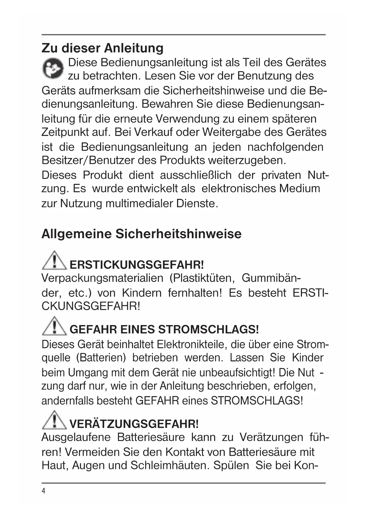 Zu dieser Anleitung Diese Bedienungsanleitung ist als Teil des Gerätes zu betrachten. Lesen Sie vor der Benutzung des Geräts aufmerksam die Sicherheitshinweise und die Be- dienungsanleitung. Bewahren Sie diese Bedienungsan- leitung für die erneute Verwendung zu einem späteren Zeitpunkt auf. Bei Verkauf oder Weitergabe des Gerätes ist die Bedienungsanleitung an jeden nachfolgenden Besitzer/Benutzer des Produkts weiterzugeben. Dieses Produkt dient ausschließlich der privaten Nut- zung. Es wurde entwickelt als elektronisches Medium zur Nutzung multimedialer Dienste. Allgemeine Sicherheitshinweise ERSTICKUNGSGEFAHR! Verpackungsmaterialien (Plastiktüten, Gummibän- der, etc.) von Kindern fernhalten! Es besteht ERSTI- CKUNGSGEFAHR! GEFAHR EINES STROMSCHLAGS! Dieses Gerät beinhaltet Elektronikteile, die über eine Strom- quelle (Batterien) betrieben werden. Lassen Sie Kinder beim Umgang mit dem Gerät nie unbeaufsichtigt! Die Nut