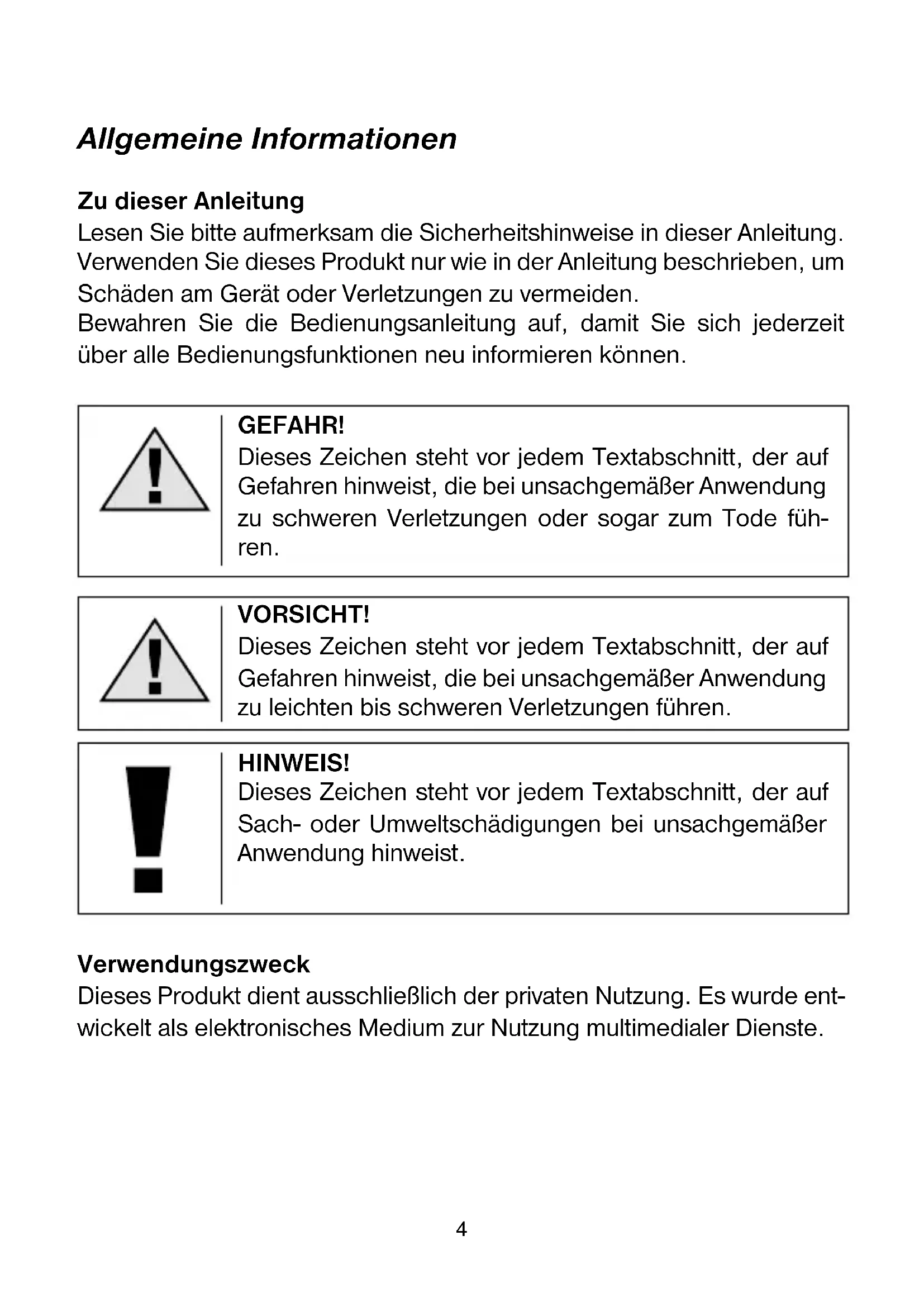 Achtung! Bei Neuinbetriebnahme und Batteriewechsel: Legen Sie zuerst die Batterien der Wetterstation ein und danach die Batterien des Außensensors! Attention! For fi rst time operation and battery replacement: First insert batteries for main unit and then insert batteries for remote sensor. Attention! Pour la première utilisation et le changement des piles : Placez en premier lieu les piles dans l’unité principale, puis ensuite dans le capteur extérieur! Attenzione! Alla prima messa in funzione e nel caso di sostituzione della batteria: Inserire prima le batterie della stazione meteorologica e dopo quelle del sensore esterno! Atención! Para la primera vez que utilice el producto y para cambios de pilas: Primero insertar las pilas en la unidad principal y después insertar las pilas del sensor externo.34 Allgemeine Informationen Zu dieser Anleitung Lesen Sie bitte aufmerksam die Sicherheitshinweise in dieser Anleitung. Verwenden Sie dieses Produkt nur wie in der Anleitung beschrieben, um Schäden am Gerät oder Verletzungen zu vermeiden. Bewahren Sie die Bedienungsanleitung auf, damit Sie sich jederzeit über alle Bedienungsfunktionen neu informieren können. GEFAHR! Dieses Zeichen steht vor jedem Textabschnitt, der auf Gefahren hinweist, die bei unsachgemäßer Anwendung zu schweren Verletzungen oder sogar zum Tode füh- ren. VORSICHT! Dieses Zeichen steht vor jedem Textabschnitt, der auf Gefahren hinweist, die bei unsachgemäßer Anwendung zu leichten bis schweren Verletzungen führen. HINWEIS! Dieses Zeichen steht vor jedem Textabschnitt, der auf Sach- oder Umweltschädigungen bei unsachgemäßer Anwendung hinweist. Verwendungszweck Dieses Produkt dient ausschließlich der privaten Nutzung. Es wurde ent- wickelt als elektronisches Medium zur Nutzung multimedialer Dienste.DE/BE/CH