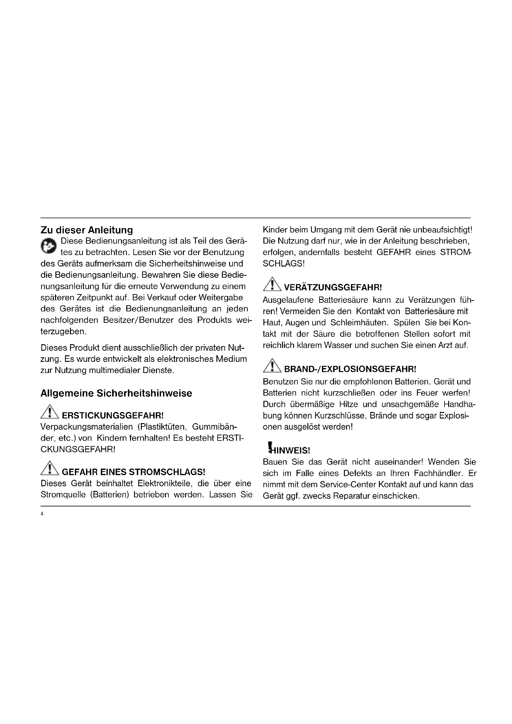 Zu dieser Anleitung Diese Bedienungsanleitung ist als Teil des Gerä- tes zu betrachten. Lesen Sie vor der Benutzung des Geräts aufmerksam die Sicherheitshinweise und die Bedienungsanleitung. Bewahren Sie diese Bedie- nungsanleitung für die erneute Verwendung zu einem späteren Zeitpunkt auf. Bei Verkauf oder Weitergabe des Gerätes ist die Bedienungsanleitung an jeden nachfolgenden Besitzer/Benutzer des Produkts wei- terzugeben. Dieses Produkt dient ausschließlich der privaten Nut- zung. Es wurde entwickelt als elektronisches Medium zur Nutzung multimedialer Dienste. Allgemeine Sicherheitshinweise ERSTICKUNGSGEFAHR! Verpackungsmaterialien (Plastiktüten, Gummibän- der, etc.) von Kindern fernhalten! Es besteht ERSTI- CKUNGSGEFAHR! GEFAHR EINES STROMSCHLAGS! Dieses Gerät beinhaltet Elektronikteile, die über eine Stromquelle (Batterien) betrieben werden. Lassen Sie Kinder beim Umgang mit dem Gerät nie unbeaufsichtigt! Die Nutzung darf nur, wie in der Anleitung beschrieben, erfolgen, andernfalls besteht GEFAHR eines STROM