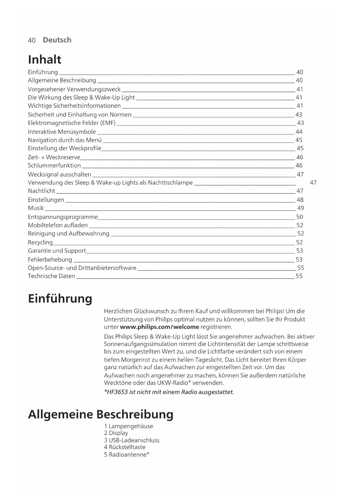 Deutsch Inhalt Einführung _______________________________________________________________________________ 40 Allgemeine Beschreibung __________________________________________________________________ 40 Vorgesehener Verwendungszweck __________________________________________________________ 41 Die Wirkung des Sleep & Wake-Up Light _____________________________________________________ 41 Wichtige Sicherheitsinformationen __________________________________________________________ 41 Sicherheit und Einhaltung von Normen ______________________________________________________ 43 Elektromagnetische Felder (EMF) ____________________________________________________________ 43 Interaktive Menüsymbole __________________________________________________________________ 44 Navigation durch das Menü ________________________________________________________________ 45 Einstellung der Weckprofile_________________________________________________________________ 45 Zeit- + Weckreserve________________________________________________________________________ 46 Schlummerfunktion _______________________________________________________________________ 46 Wecksignal ausschalten ____________________________________________________________________ 47 Verwendung des Sleep & Wake-up Lights als Nachttischlampe __________________________________ 47 Nachtlicht ________________________________________________________________________________ 47 Einstellungen _____________________________________________________________________________ 48 Musik ____________________________________________________________________________________ 49 Entspannungsprogramme__________________________________________________________________ 50 Mobiltelefon aufladen _____________________________________________________________________ 52 Reinigung und Aufbewahrung ______________________________________________________________ 52 Recycling_________________________________________________________________________________ 52 Garantie und Support______________________________________________________________________ 53 Fehlerbehebung __________________________________________________________________________ 53 Open-Source- und Drittanbietersoftware _____________________________________________________ 55 Technische Daten _________________________________________________________________________ 55 Einführung Herzlichen Glückwunsch zu Ihrem Kauf und willkommen bei Philips! Um die Unterstützung von Philips optimal nutzen zu können, sollten Sie Ihr Produkt unter www.philips.com/welcome registrieren. Das Philips Sleep & Wake-Up Light lässt Sie angenehmer aufwachen. Bei aktiver Sonnenaufgangssimulation nimmt die Lichtintensität der Lampe schrittweise bis zum eingestellten Wert zu, und die Lichtfarbe verändert sich von einem tiefen Morgenrot zu einem hellen Tageslicht. Das Licht bereitet Ihren Körper ganz natürlich auf das Aufwachen zur eingestellten Zeit vor. Um das Aufwachen noch angenehmer zu machen, können Sie außerdem natürliche Wecktöne oder das UKW-Radio* verwenden. *HF3653 ist nicht mit einem Radio ausgestattet. Allgemeine Beschreibung 1 Lampengehäuse 2 Display 3 USB-Ladeanschluss 4 Rückstelltaste 5 Radioantenne*41 Deutsch 6 DC-Adapteranschluss 7 AUX-Eingang 8 Lautsprecher 9 Schlummer-/Nachtlichttaste 10 Adapter 11 Gerätestecker *HF3653 ist nicht mit einem Radio ausgestattet. Vorgesehener Verwendungszweck Das Philips Wake-Up Light soll Ihnen ein natürlicheres und erholteres Aufwachen und ein entspanntes Gefühl vor dem Einschlafen ermöglichen. Dies ist kein allgemeines Beleuchtungsprodukt. Die Wirkung des Sleep & Wake-Up Light Das Philips Sleep & Wake-Up Light bereitet ihren Körper in den letzten 30Minuten des Schlafs sanft auf das Aufwachen vor. In den frühen Morgenstunden sind unsere Augen lichtempfindlicher als während der Wachphasen am Tag. In dieser Phase bereitet sich der Körper dank der relativ geringen Lichtintensität eines simulierten Sonnenaufgangs auf das Aufwachen und Munterwerden vor. Durch die Anwendung des Sleep & Wake-Up Light werden Sie leichter wach und fühlen sich wohler und energiegeladener. Da die Lichtempfindlichkeit bei jedem Menschen unterschiedlich ist, können Sie die Lichtintensität Ihres Sleep & Wake-Up Light so einstellen, dass sie Ihrer Lichtempfindlichkeit für einen optimalen Start in den Tag am besten entspricht. Um die Wirkung des Sleep & Wake-Up Light vollständig zu erleben, stellen Sie das Gerät etwa 40–50cmvon Ihrem Kopf entfernt auf einer ebenen, stabilen Fläche Ihres Nachttischs auf. Weitere Informationen zum Sleep & Wake-Up Light finden Sie unter www.philips.com. Wichtige Sicherheitsinformationen Lesen Sie diese wichtigen Informationen vor dem Gebrauch des Geräts aufmerksam durch und bewahren Sie sie für eine spätere Verwendung auf. Gefahr