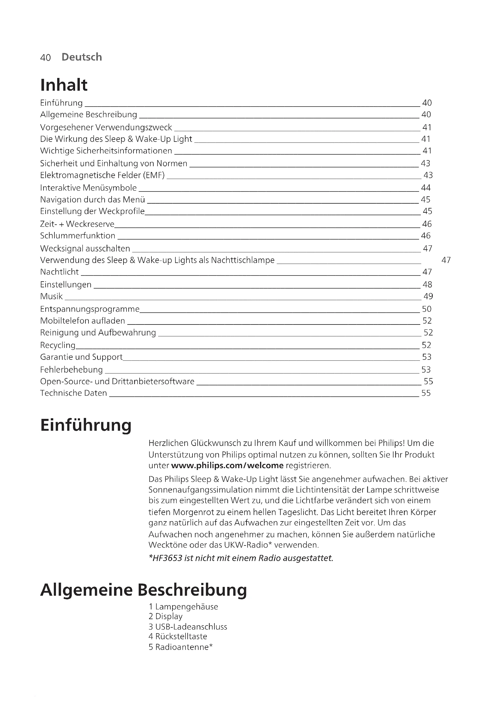 Deutsch Inhalt Einführung _______________________________________________________________________________ 40 Allgemeine Beschreibung __________________________________________________________________ 40 Vorgesehener Verwendungszweck __________________________________________________________ 41 Die Wirkung des Sleep & Wake-Up Light _____________________________________________________ 41 Wichtige Sicherheitsinformationen __________________________________________________________ 41 Sicherheit und Einhaltung von Normen ______________________________________________________ 43 Elektromagnetische Felder (EMF) ____________________________________________________________ 43 Interaktive Menüsymbole __________________________________________________________________ 44 Navigation durch das Menü ________________________________________________________________ 45 Einstellung der Weckprofile_________________________________________________________________ 45 Zeit- + Weckreserve________________________________________________________________________ 46 Schlummerfunktion _______________________________________________________________________ 46 Wecksignal ausschalten ____________________________________________________________________ 47 Verwendung des Sleep & Wake-up Lights als Nachttischlampe __________________________________ 47 Nachtlicht ________________________________________________________________________________ 47 Einstellungen _____________________________________________________________________________ 48 Musik ____________________________________________________________________________________ 49 Entspannungsprogramme__________________________________________________________________ 50 Mobiltelefon aufladen _____________________________________________________________________ 52 Reinigung und Aufbewahrung ______________________________________________________________ 52 Recycling_________________________________________________________________________________ 52 Garantie und Support______________________________________________________________________ 53 Fehlerbehebung __________________________________________________________________________ 53 Open-Source- und Drittanbietersoftware _____________________________________________________ 55 Technische Daten _________________________________________________________________________ 55 Einführung Herzlichen Glückwunsch zu Ihrem Kauf und willkommen bei Philips! Um die Unterstützung von Philips optimal nutzen zu können, sollten Sie Ihr Produkt unter www.philips.com/welcome registrieren. Das Philips Sleep & Wake-Up Light lässt Sie angenehmer aufwachen. Bei aktiver Sonnenaufgangssimulation nimmt die Lichtintensität der Lampe schrittweise bis zum eingestellten Wert zu, und die Lichtfarbe verändert sich von einem tiefen Morgenrot zu einem hellen Tageslicht. Das Licht bereitet Ihren Körper ganz natürlich auf das Aufwachen zur eingestellten Zeit vor. Um das Aufwachen noch angenehmer zu machen, können Sie außerdem natürliche Wecktöne oder das UKW-Radio* verwenden. *HF3653 ist nicht mit einem Radio ausgestattet. Allgemeine Beschreibung 1 Lampengehäuse 2 Display 3 USB-Ladeanschluss 4 Rückstelltaste 5 Radioantenne*41 Deutsch 6 DC-Adapteranschluss 7 AUX-Eingang 8 Lautsprecher 9 Schlummer-/Nachtlichttaste 10 Adapter 11 Gerätestecker *HF3653 ist nicht mit einem Radio ausgestattet. Vorgesehener Verwendungszweck Das Philips Wake-Up Light soll Ihnen ein natürlicheres und erholteres Aufwachen und ein entspanntes Gefühl vor dem Einschlafen ermöglichen. Dies ist kein allgemeines Beleuchtungsprodukt. Die Wirkung des Sleep & Wake-Up Light Das Philips Sleep & Wake-Up Light bereitet ihren Körper in den letzten 30Minuten des Schlafs sanft auf das Aufwachen vor. In den frühen Morgenstunden sind unsere Augen lichtempfindlicher als während der Wachphasen am Tag. In dieser Phase bereitet sich der Körper dank der relativ geringen Lichtintensität eines simulierten Sonnenaufgangs auf das Aufwachen und Munterwerden vor. Durch die Anwendung des Sleep & Wake-Up Light werden Sie leichter wach und fühlen sich wohler und energiegeladener. Da die Lichtempfindlichkeit bei jedem Menschen unterschiedlich ist, können Sie die Lichtintensität Ihres Sleep & Wake-Up Light so einstellen, dass sie Ihrer Lichtempfindlichkeit für einen optimalen Start in den Tag am besten entspricht. Um die Wirkung des Sleep & Wake-Up Light vollständig zu erleben, stellen Sie das Gerät etwa 40–50cmvon Ihrem Kopf entfernt auf einer ebenen, stabilen Fläche Ihres Nachttischs auf. Weitere Informationen zum Sleep & Wake-Up Light finden Sie unter www.philips.com. Wichtige Sicherheitsinformationen Lesen Sie diese wichtigen Informationen vor dem Gebrauch des Geräts aufmerksam durch und bewahren Sie sie für eine spätere Verwendung auf. Gefahr