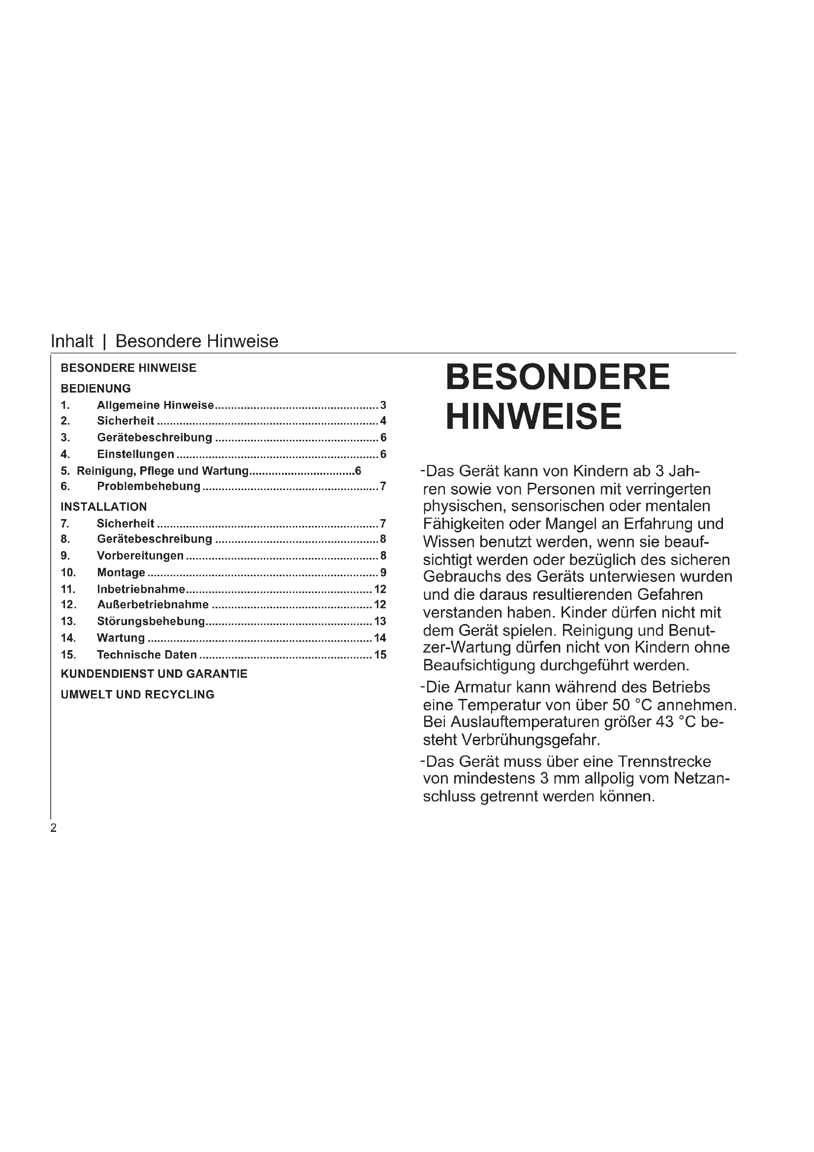 BESONDERE HINWEISE - Das Gerät kann von Kindern ab 3 Jah- ren sowie von Personen mit verringerten physischen, sensorischen oder mentalen Fähigkeiten oder Mangel an Erfahrung und Wissen benutzt werden, wenn sie beauf- sichtigt werden oder bezüglich des sicheren Gebrauchs des Geräts unterwiesen wurden und die daraus resultierenden Gefahren verstanden haben. Kinder dürfen nicht mit dem Gerät spielen. Reinigung und Benut- zer-Wartung dürfen nicht von Kindern ohne Beaufsichtigung durchgeführt werden. - Die Armatur kann während des Betriebs eine Temperatur von über 50 °C annehmen. Bei Auslauftemperaturen größer 43 °C be- steht Verbrühungsgefahr. - Das Gerät muss über eine Trennstrecke von mindestens 3 mm allpolig vom Netzan- schluss getrennt werden können.Bedienung - für den Benutzer und den Fachhandwerker
