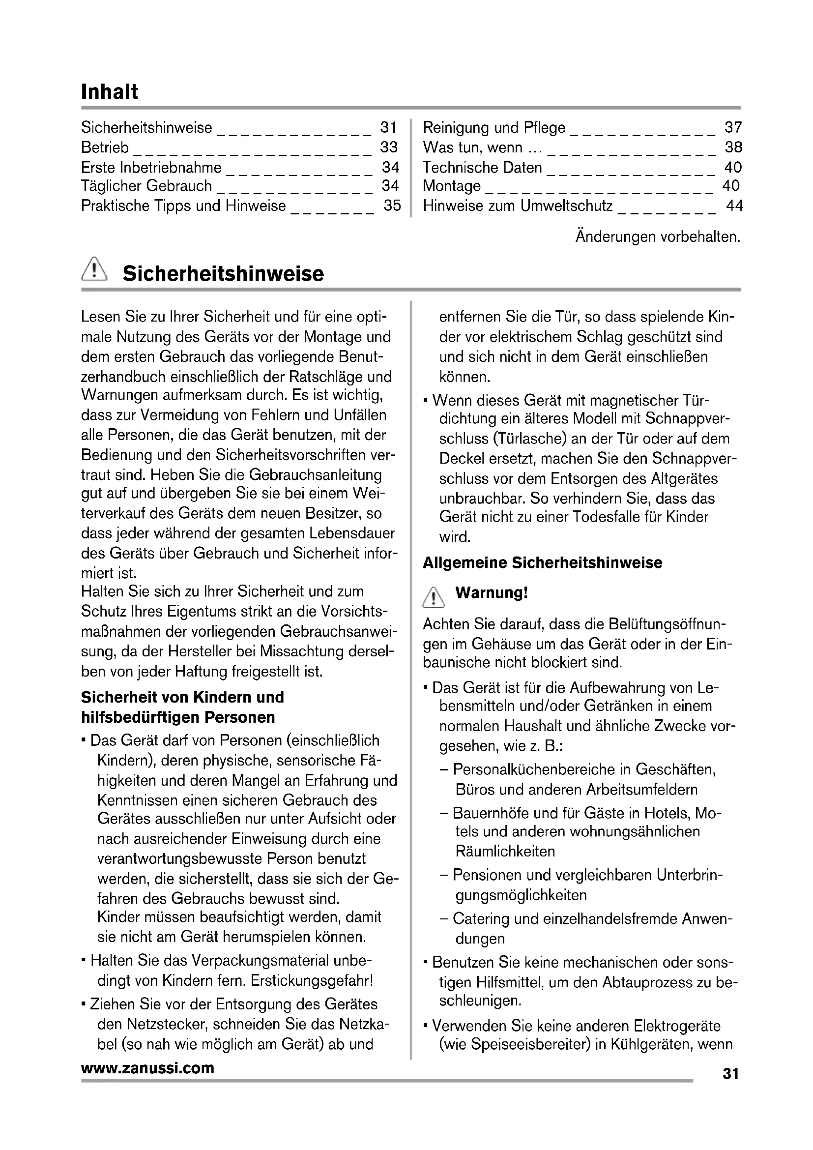 www.zanussi.comInhalt Sicherheitshinweise _ _ _ _ _ _ _ _ _ _ _ _ _ 31 Betrieb _ _ _ _ _ _ _ _ _ _ _ _ _ _ _ _ _ _ _ _ 33 Erste Inbetriebnahme _ _ _ _ _ _ _ _ _ _ _ _ 34 Täglicher Gebrauch _ _ _ _ _ _ _ _ _ _ _ _ _ 34 Praktische Tipps und Hinweise _ _ _ _ _ _ _ 35 Reinigung und Pflege _ _ _ _ _ _ _ _ _ _ _ _ 37 Was tun, wenn … _ _ _ _ _ _ _ _ _ _ _ _ _ _ 38 Technische Daten _ _ _ _ _ _ _ _ _ _ _ _ _ _ 40 Montage _ _ _ _ _ _ _ _ _ _ _ _ _ _ _ _ _ _ _ 40 Hinweise zum Umweltschutz _ _ _ _ _ _ _ _ 44 Änderungen vorbehalten. Sicherheitshinweise Lesen Sie zu Ihrer Sicherheit und für eine opti- male Nutzung des Geräts vor der Montage und dem ersten Gebrauch das vorliegende Benut- zerhandbuch einschließlich der Ratschläge und Warnungen aufmerksam durch. Es ist wichtig, dass zur Vermeidung von Fehlern und Unfällen alle Personen, die das Gerät benutzen, mit der Bedienung und den Sicherheitsvorschriften ver- traut sind. Heben Sie die Gebrauchsanleitung gut auf und übergeben Sie sie bei einem Wei- terverkauf des Geräts dem neuen Besitzer, so dass jeder während der gesamten Lebensdauer des Geräts über Gebrauch und Sicherheit infor- miert ist. Halten Sie sich zu Ihrer Sicherheit und zum Schutz Ihres Eigentums strikt an die Vorsichts- maßnahmen der vorliegenden Gebrauchsanwei- sung, da der Hersteller bei Missachtung dersel- ben von jeder Haftung freigestellt ist. Sicherheit von Kindern und hilfsbedürftigen Personen