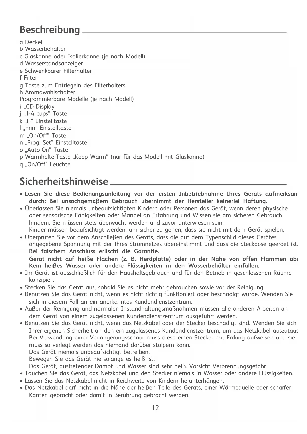 ENBeschreibung a Deckel b Wasserbehälter c Glaskanne oder Isolierkanne (je nach Modell) d Wasserstandsanzeiger e Schwenkbarer Filterhalter f Filter g Taste zum Entriegeln des Filterhalters h Aromawahlschalter Programmierbare Modelle (je nach Modell) i LCD-Display j „1-4 cups” Taste k „H” Einstelltaste l „min” Einstelltaste m „On/Off” Taste n „Prog. Set” Einstelltaste o „Auto-On” Taste p Warmhalte-Taste „Keep Warm” (nur für das Modell mit Glaskanne) q „On/Off” Leuchte Sicherheitshinweise