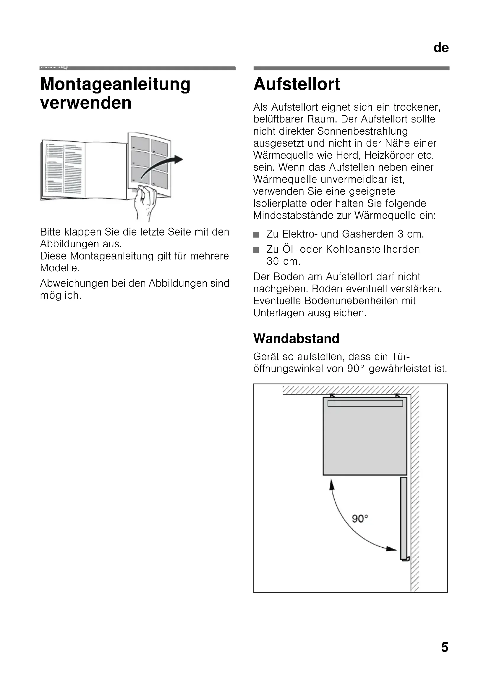 deInhaltsverzeichni s deMontageanleitung S tand ge rät Montageanleitung verwenden Bitte klappen Sie die letzte Seite mit den Abbildungen aus. Diese Montageanleitung gilt für mehrere Modelle. Abweichungen bei den Abbildungen sind möglich. Aufstellort Als Aufstellort eignet sich ein trockener, belüftbarer Raum. Der Aufstellort sollte nicht direkter Sonnenbestrahlung ausgesetzt und nicht in der Nähe einer Wärmequelle wie Herd, Heizkörper etc. sein. Wenn das Aufstellen neben einer Wärmequelle unvermeidbar ist, verwenden Sie eine geeignete Isolierplatte oder halten Sie folgende Mindestabstände zur Wärmequelle ein: ■ Zu Elektro- und Gasherden 3 cm. ■ Zu Öl- oder Kohleanstellherden 30 cm. Der Boden am Aufstellort darf nicht nachgeben. Boden eventuell verstärken. Eventuelle Bodenunebenheiten mit Unterlagen ausgleichen. Wandabstand Gerät so aufstellen, dass ein Tür- öffnungswinkel von 90° gewährleistet ist.de