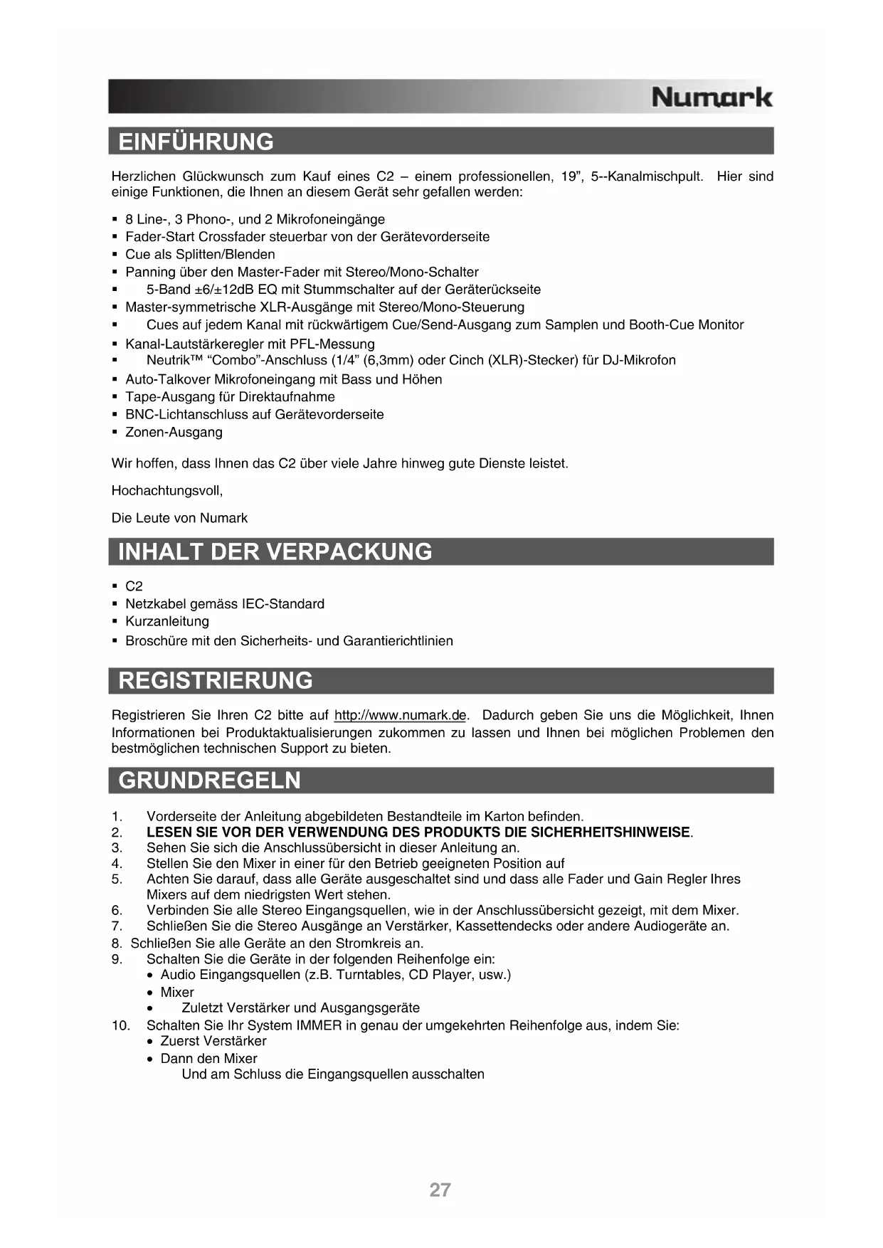 dopo aver collegato tutti i dispositivi d’ingresso e prima di accendere gli amplificatori. Spegnere gli amplificatori prima di spegnere il mixer.27 EINFÜHRUNG Herzlichen Glückwunsch zum Kauf eines C2 – einem professionellen, 19”, 5--Kanalmischpult. Hier sind einige Funktionen, die Ihnen an diesem Gerät sehr gefallen werden: 8 Line-, 3 Phono-, und 2 Mikrofoneingänge Fader-Start Crossfader steuerbar von der Gerätevorderseite Cue als Splitten/Blenden Panning über den Master-Fader mit Stereo/Mono-Schalter 5-Band ±6/±12dB EQ mit Stummschalter auf der Geräterückseite Master-symmetrische XLR-Ausgänge mit Stereo/Mono-Steuerung Cues auf jedem Kanal mit rückwärtigem Cue/Send-Ausgang zum Samplen und Booth-Cue Monitor Kanal-Lautstärkeregler mit PFL-Messung Neutrik™ “Combo”-Anschluss (1/4” (6,3mm) oder Cinch (XLR)-Stecker) für DJ-Mikrofon Auto-Talkover Mikrofoneingang mit Bass und Höhen Tape-Ausgang für Direktaufnahme BNC-Lichtanschluss auf Gerätevorderseite Zonen-Ausgang Wir hoffen, dass Ihnen das C2 über viele Jahre hinweg gute Dienste leistet. Hochachtungsvoll, Die Leute von Numark