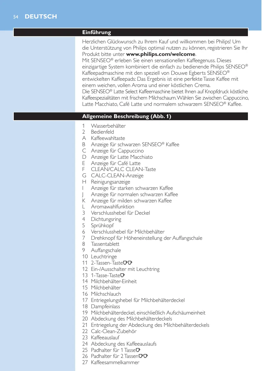 DEUTSCH Einführung Herzlichen Glückwunsch zu Ihrem Kauf und willkommen bei Philips! Um die Unterstützung von Philips optimal nutzen zu können, registrieren Sie Ihr Produkt bitte unter www.philips.com/welcome. Mit SENSEO® erleben Sie einen sensationellen Kaffeegenuss. Dieses einzigartige System kombiniert die einfach zu bedienende Philips SENSEO® Kaffeepadmaschine mit den speziell von Douwe Egberts SENSEO® entwickelten Kaffeepads: Das Ergebnis ist eine perfekte Tasse Kaffee mit einem weichen, vollen Aroma und einer köstlichen Crema. Die SENSEO® Latte Select Kaffeemaschine bietet Ihnen auf Knopfdruck köstliche Kaffeespezialitäten mit frischem Milchschaum. Wählen Sie zwischen Cappuccino, Latte Macchiato, Café Latte und normalem schwarzem SENSEO® Kaffee. Allgemeine Beschreibung (Abb. 1) 1 2 A B C D E F G H I J K L 3 4 5 6 7 8 9 10 11 12 13 14 15 16 17 18 19 20 21 22 23 24 25 26 27