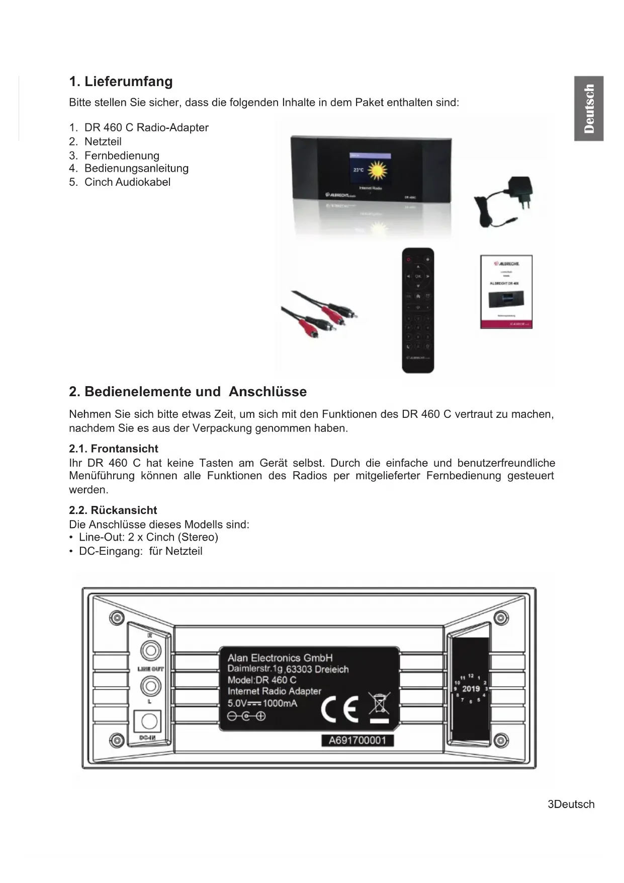 Eingabetaste, wenn Sie mit der Eingabe fertig sind. HINWEIS: Für die Eingabe von Zahlen können auch die Zifferntasten auf der Fernbedienung verwendet werden. 3.4. Anschluß an ein Audiosystem Verbinden Sie das DR 460 C mit dem beiliegendem Cinch-Audiokabel (RCA) mit Ihrem bestehenden Audiosystem (z.B. Stereoanlage, externer Lautsprecher, etc.).6 Deutsch Deutsch 3.5. Inbetriebnahme Schließen Sie das Netzteil auf der Rückseite des DR 460 C an und verbinden Sie den Netzstecker mit einer Steckdose. Bei Erstgebrauch des Geräts wählen Sie bitte eine Sprache (Language) und ein drahtloses Netzwerk (Network) aus. Siehe Abschnitt „9.3. Netzwerk“ auf Seite 14 für detaillierte Netzwerkkon gurationen. Sie können die Netzwerkverbindung gleich oder später einstellen.
