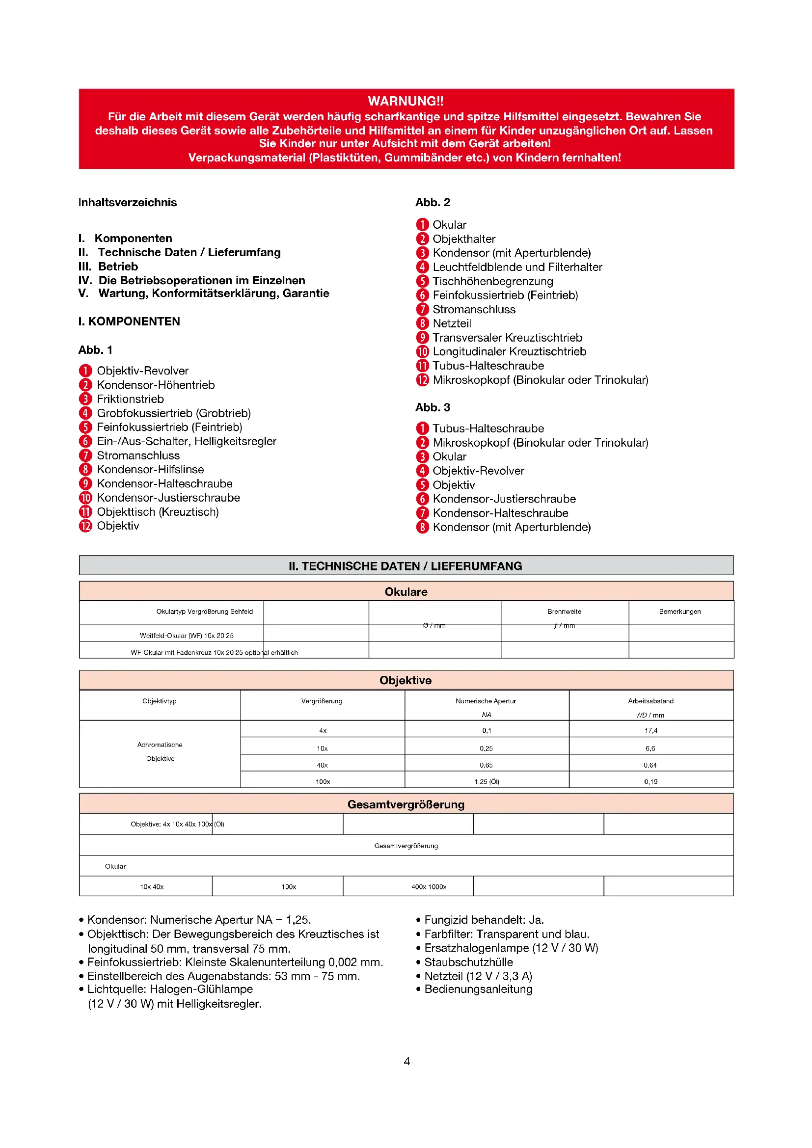 Kondensor (mit Aperturblende) Okulartyp Vergrößerung Sehfeld Ø / mm Brennweite ƒ / mm Bemerkungen Weitfeld-Okular (WF) 10x 20 25 WF-Okular mit Fadenkreuz 10x 20 25 optional erhältlich Objektive: 4x 10x 40x 100x (Öl) Gesamtvergrößerung Okular: 10x 40x 100x 400x 1000x Objektivtyp Vergrößerung Numerische Apertur
