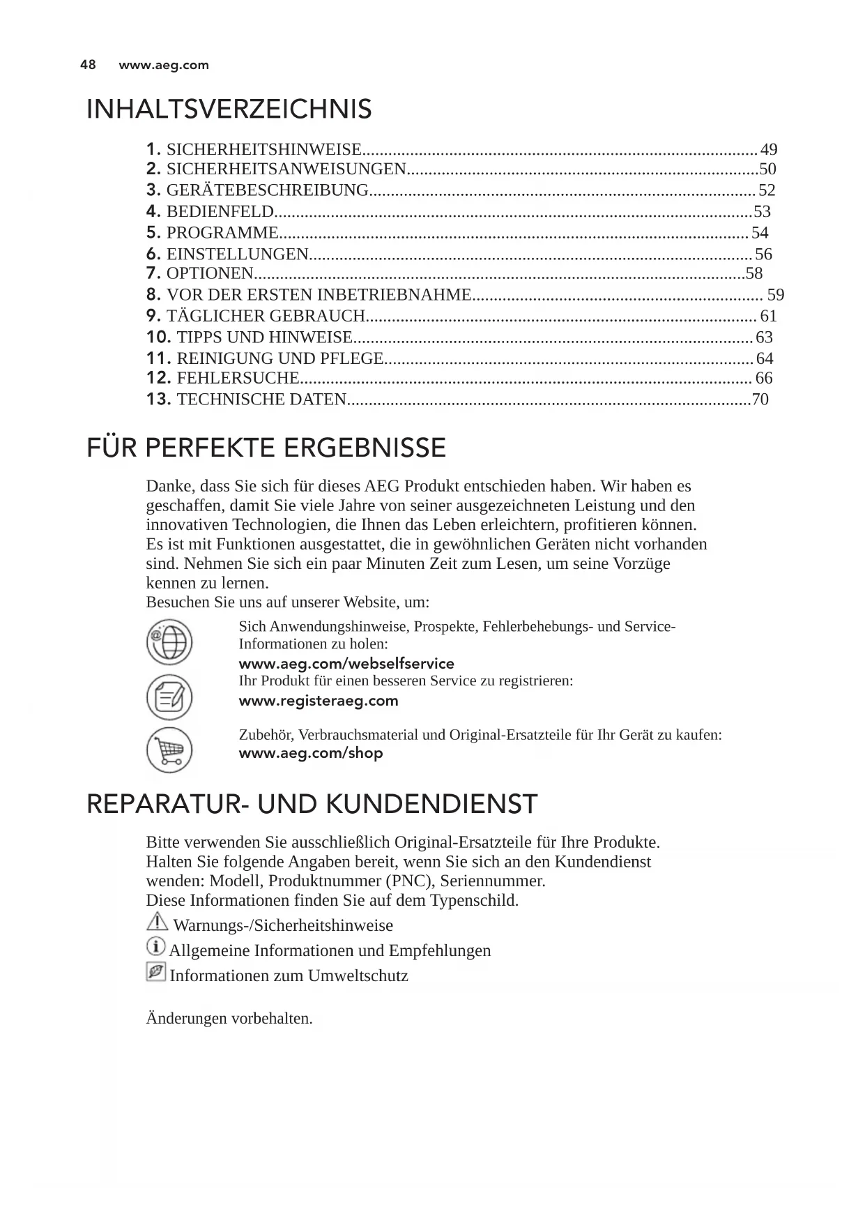 Bitte verwenden Sie ausschließlich Original-Ersatzteile für Ihre Produkte. Halten Sie folgende Angaben bereit, wenn Sie sich an den Kundendienst wenden: Modell, Produktnummer (PNC), Seriennummer. Diese Informationen finden Sie auf dem Typenschild. Warnungs-/Sicherheitshinweise Allgemeine Informationen und Empfehlungen Informationen zum Umweltschutz Änderungen vorbehalten. www.aeg.com