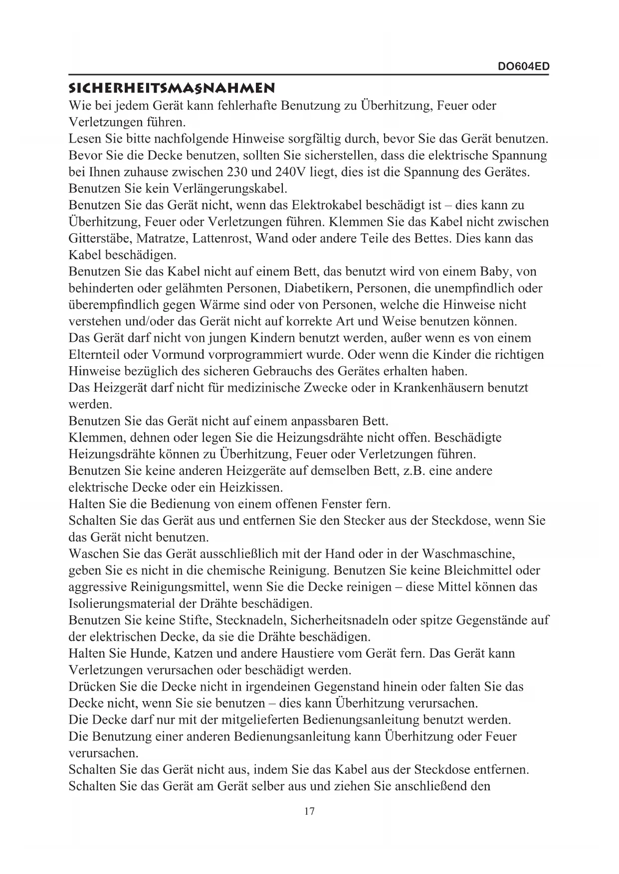 Lesen Sieitte nachfolgende Hinweise sorgfaltig durch,bevor Sie das Gerat benutzen. Bevor Sie die Decke benutzen, sollten Sie sicherstellen,dass die elektrische Spannung bei Ihnen zuhause zwischen 230 und 240V liegt, dies ist die Spannung des Gerates.