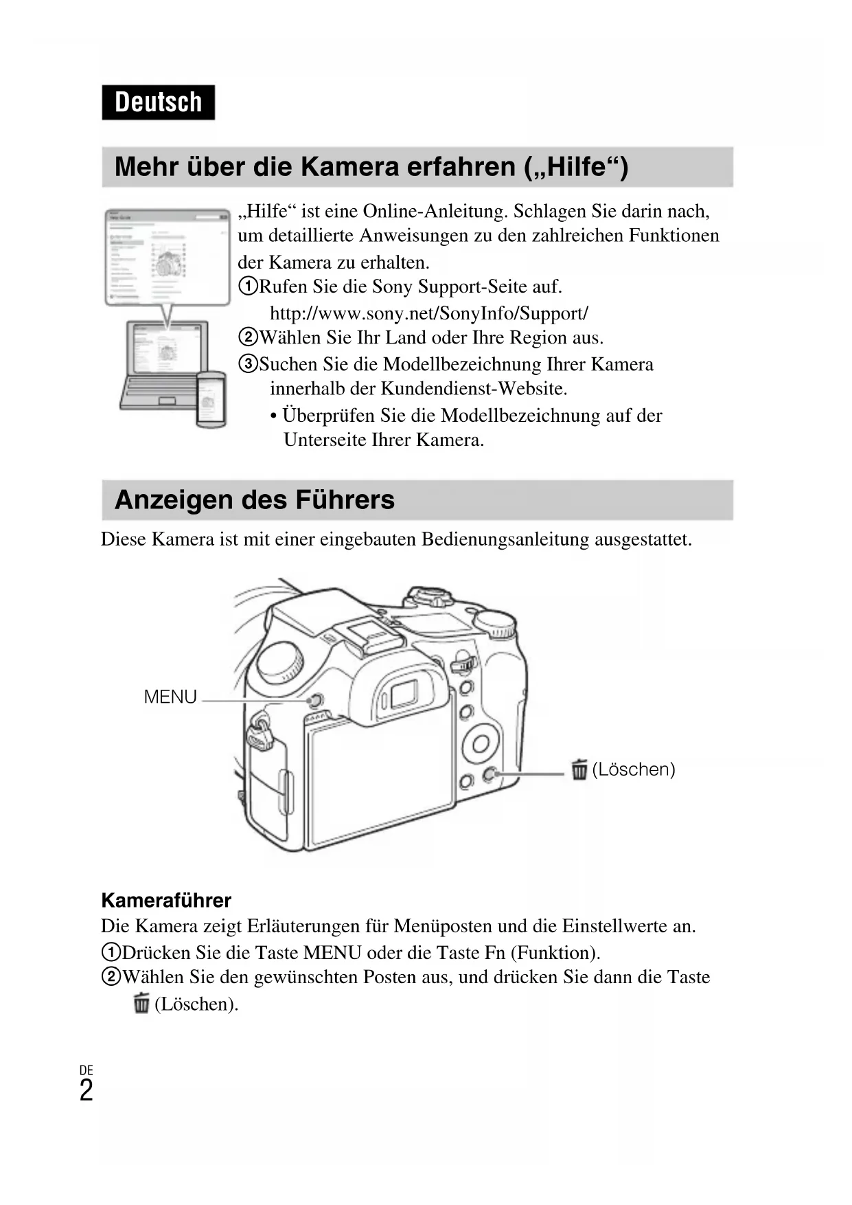 Diese Kamera ist mit einer eingebauten Bedienungsanleitung ausgestattet. Kameraführer Die Kamera zeigt Erläuterungen für Menüposten und die Einstellwerte an. 1 Drücken Sie die Taste MENU oder die Taste Fn (Funktion). 2 Wählen Sie den gewünschten Posten aus, und drücken Sie dann die Taste (Löschen). Deutsch Mehr über die Kamera erfahren („Hilfe“) „Hilfe“ ist eine Online-Anleitung. Schlagen Sie darin nach, um detaillierte Anweisungen zu den zahlreichen Funktionen der Kamera zu erhalten. 1 Rufen Sie die Sony Support-Seite auf. http://www.sony.net/SonyInfo/Support/ 2 Wählen Sie Ihr Land oder Ihre Region aus. 3 Suchen Sie die Modellbezeichnung Ihrer Kamera innerhalb der Kundendienst-Website.