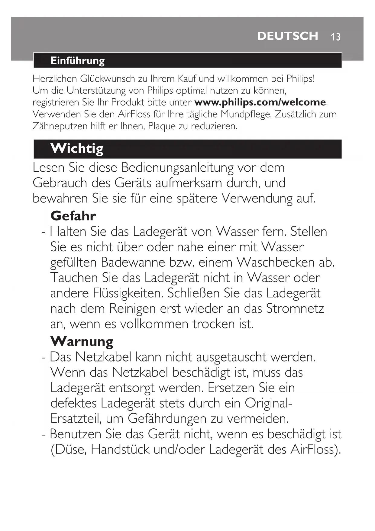 Philips Sonicare AirFloss1Philips Sonicare AirFloss ENGLISH 6 DEUTSCH 13 ΕΛΛΗΝΙΚΑ 21 ESPAÑOL 30 FRANÇAIS 38 ITALIANO 46 NEDERLANDS 54 PORTUGUÊS 626 Introduction Congratulations on your purchase and welcome to Philips! To fully benet from the support that Philips offers, register your product at www.philips.com/welcome. Use the AirFloss as part of your oral care routine. In addition to brushing, it helps reduce plaque. Important Read this user manual carefully before you use the appliance and save it for future reference. Danger - Keep the charger away from water. Do not place or store it over or near water contained in a bathtub, washbasin, etc. Do not immerse the charger in water or any other liquid. After cleaning, make sure the charger is completely dry before you connect it to the mains Warning - The mains cord cannot be replaced. If the mains cord is damaged, discard the charger. Always have the charger replaced with one of the original type in order to avoid a hazard. - If the appliance is damaged in any way (AirFloss nozzle, handle and/or charger), stop using it. - This appliance contains no serviceable parts. If the appliance is damaged, contact the Consumer Care Centre in your country (see chapter ‘Guarantee and support’). - Do not use the charger outdoors or near heated surfaces. ENGLISH- This appliance can be used by children aged from 8 years and above and by persons with reduced physical, sensory or mental capabilities or lack of experience and knowledge if they have been given supervision or instruction concerning use of the appliance in a safe way and if they understand the hazards involved. Children shall not play with the appliance. Cleaning and user maintenance shall not be made by children unless they are older than 8 and supervised. Caution - If you have had recent oral or gum surgery, suffer from an ongoing dental condition or had extensive dental work in the previous 2 months, consult your dentist before you use this appliance. - Consult your dentist if excessive bleeding occurs after using this appliance or if bleeding continues to occur after 1 week of use. - If you have medical concerns, consult your doctor before you use this appliance. - This Philips appliance complies with the safety standards for electromagnetic devices. If you have a pacemaker or other implanted device, contact your physician or the appliance manufacturer of the implanted appliance prior to use. - Do not use attachments other than the ones recommended by the manufacturer. - Do not exert excessive pressure on the guidance tip of the nozzle. ENGLISH 7- To avoid physical injury, do not ll the reservoir with hot water. Do not put foreign objects in the reservoir. - Only use the AirFloss for its intended purpose as described in this user manual. - To avoid physical injury, do not direct the spray under the tongue or into the ear, nose, eye or other sensitive area. - Do not clean the AirFloss nozzle, the handle, the charger, the water reservoir and its cover in the dishwasher or a microwave. - To avoid an ingestion hazard, do not put isopropyl alcohol or other cleaning uids in the reservoir. - The AirFloss is a personal care device and is not intended for use on multiple patients in a dental practice or institution. Electromagnetic elds (EMF) This Philips appliance complies with all applicable standards and regulations regarding exposure to electromagnetic elds. General description (Fig. 1) 1 Guidance tip 2 AirFloss nozzle 3 Activation button 4 Reservoir and cover 5 Handle 6 Charge indicator 7 Power on/off button 8 Removable nozzle holder (specic types only) 9 Charger Note: The contents of the box may vary based on the model purchased. ENGLISH8Charging Charge the AirFloss for 24 hours before rst use. 1 Put the plug of the charger in the wall socket (Fig. 2). 2 Place the handle on the charger (Fig. 3). , The charge indicator ashes green to indicate that the appliance is charging (Fig. 4). Note: When it is fully charged, the AirFloss has an operating time of up to 2 weeks (or 14 uses). Note: When the charge indicator ashes yellow, the battery is low and needs to be recharged (fewer than 3 uses left). Preparing for use 1 Align the nozzle so the tip faces the front of the handle and press the nozzle down onto the handle (‘click’) (Fig. 5). Note: Replace the nozzle every 6 months for optimal results. Also replace the nozzle if it becomes loose or no longer clicks onto the handle. 2 Open the cover of the reservoir (‘click’) (Fig. 6). 3 Fill the reservoir with mouthwash or water (Fig. 7). Note: To operate effectively, the AirFloss has to contain either mouthwash or water. Tip: For a fresher experience, use mouthwash instead of water. Note: Do not use mouthwash that contains isopropyl myristate (e.g. Dentyl Active) or high concentrations of essentials oils, as it may damage the appliance. This includes all mouthwash sold in glass and ceramic packaging. 4 Close the cover of the reservoir (‘click’) (Fig. 8). 5 Press the on/off button (Fig. 9). , The green charge indicator lights up. 6 Press and hold the activation button until spray comes out of the tip of the nozzle (Fig. 10). ENGLISH 9Using the appliance 1 Make sure the AirFloss is switched on (Fig. 9). 2 Place the tip between the teeth and apply gentle pressure. Slightly close your lips over the nozzle when it is in place, to avoid splashing (Fig. 11). Tip: Use your nger to press the activation button. Note: The AirFloss is intended to be used on the front/outside surface of the teeth only. 3 Press the activation button to deliver a single burst of air and micro-droplets of mouthwash or water between the teeth. Alternatively, hold the activation button to deliver continuous bursts of mouthwash or water approximately every 1 second (select models) (Fig. 12). 4 Slide the guidance tip along the gum line until you feel it settle between the next two teeth. 5 Continue this procedure for all spaces including behind your back teeth (F