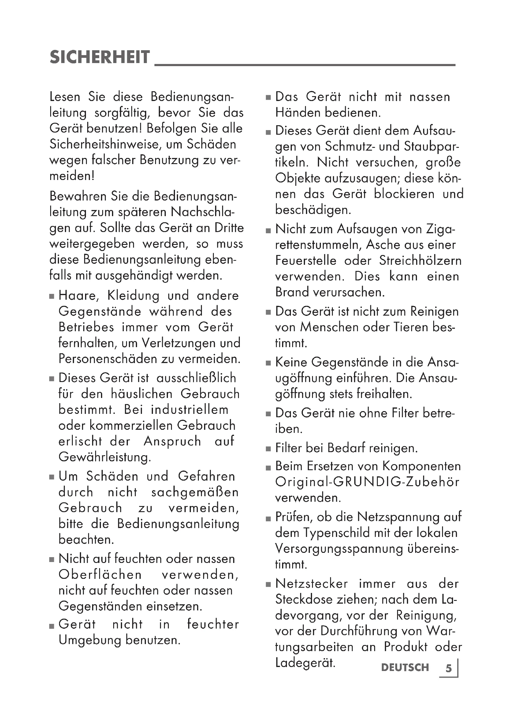 Ausschließlich das mitgelieferte Kabel verwenden.7 DEUTSC H ÜBERSICHT ________________________________ Sehr geehrte Kundin, sehr geehrter Kunde, Herzlichen Glückwunsch zum Kauf Ihres neuen vertikalen 2-in-1-Akku- Staubsaugers von GRUNDIG VCH VCH 9630-VCH 9631-VCH 9632. Bitte lesen Sie die folgenden Hinweise sorgfältig, damit dieses Qualitätsprodukt aus dem Hause GRUNDIG viele Jahre lang gute Dienste leistet. Verantwortungsbewusstes Handeln! GRUNDIG setzt intern wie auch bei unseren Lieferanten auf vertraglich zugesicherte soziale Arbeitsbedingungen mit fairem Lohn, auf effizienten Rohstoffeinsatz bei stetiger Abfallreduzierung von mehreren Tonnen Plastik pro Jahr – und auf mindestens 5 Jahre Verfügbarkeit sämtlichen Zubehörs. Für eine lebenswerte Zukunft. Aus gutem Grund. Grundig. HEPA-Filter HEPA steht für High Efficiency Particulate Air. HEPA-Filter sind Schwebstofffilter, die mehr als 99,9 % aller Staubpartikel in der Luft filtern, die größer als 0,1 bis 0,3 Mikrometer sind. Der Filter fängt Viren, lungengängige Stäube, Milbeneier und -ausscheidungen, Pollen, Rauchpartikel, Asbest, Bakterien, diverse toxische Stäube und Aerosole ein. Zusätzliches Zubehör: Abwaschbarer HEPA H10-Filter Staubbürste eignet sich für die Reinigung von Vorhängen, empfindlichen und zerbrechlichen Gegenständen. Polsterdüse für Böden, Treppen, Fahrzeuge, Sofas und Armlehnen. Ladestation mit Zubehörfach Bedienelemente Siehe Abbildung auf Seite 3.