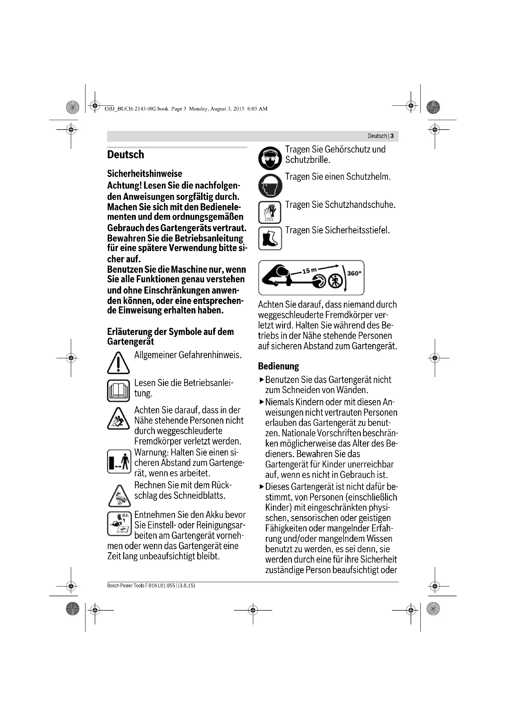 GFR Professional 25 | 42 de Originalbetriebsanleitung en Original instructions fr Notice originale es Manual original pt Manual original it Istruzioni originali nl Oorspronkelijke gebruiksaanwijzing da Original brugsanvisning sv Bruksanvisning i original no Original driftsinstruks fi Alkuperäiset ohjeet el Πρωτότυπο οδηγιών χρήσης tr Orijinal işletme talimatı OBJ_DOKU-38710-002.fm Page 1 Monday, August 3, 2015 8:02 AM2 | F 016 L81 055 | (3.8.15) Bosch Power Tools Deutsch . . . . . . . . . . . . . . . . . . . . . . . . . . . . . . . . . . . . . . . . . Seite 3 English . . . . . . . . . . . . . . . . . . . . . . . . . . . . . . . . . . . . . . . . . . Page 12 Français . . . . . . . . . . . . . . . . . . . . . . . . . . . . . . . . . . . . . . . . . Page 21 Español . . . . . . . . . . . . . . . . . . . . . . . . . . . . . . . . . . . . . . . . Página 30 Português. . . . . . . . . . . . . . . . . . . . . . . . . . . . . . . . . . . . . . . Página 40 Italiano . . . . . . . . . . . . . . . . . . . . . . . . . . . . . . . . . . . . . . . . . Pagina 49 Nederlands . . . . . . . . . . . . . . . . . . . . . . . . . . . . . . . . . . . . . Pagina 59 Dansk . . . . . . . . . . . . . . . . . . . . . . . . . . . . . . . . . . . . . . . . . . . Side 68 Svenska . . . . . . . . . . . . . . . . . . . . . . . . . . . . . . . . . . . . . . . . . Sida 76 Norsk . . . . . . . . . . . . . . . . . . . . . . . . . . . . . . . . . . . . . . . . . . . Side 84 Suomi. . . . . . . . . . . . . . . . . . . . . . . . . . . . . . . . . . . . . . . . . . . . Sivu 92 Ελληνικά. . . . . . . . . . . . . . . . . . . . . . . . . . . . . . . . . . . . . . . . Σελίδα 100 Türkçe . . . . . . . . . . . . . . . . . . . . . . . . . . . . . . . . . . . . . . . . . Sayfa 110 OBJ_BUCH-2143-002.book Page 2 Monday, August 3, 2015 8:03 AMDeutsch | 3 Bosch Power Tools F 016 L81 055 | (3.8.15) Deutsch Sicherheitshinweise Achtung! Lesen Sie die nachfolgen- den Anweisungen sorgfältig durch. Machen Sie sich mit den Bedienele- menten und dem ordnungsgemäßen Gebrauch des Gartengeräts vertraut. Bewahren Sie die Betriebsanleitung für eine spätere Verwendung bitte si- cher auf. Benutzen Sie die Maschine nur, wenn Sie alle Funktionen genau verstehen und ohne Einschränkungen anwen- den können, oder eine entsprechen- de Einweisung erhalten haben. Erläuterung der Symbole auf dem Gartengerät Allgemeiner Gefahrenhinweis. Lesen Sie die Betriebsanlei- tung. Achten Sie darauf, dass in der Nähe stehende Personen nicht durch weggeschleuderte Fremdkörper verletzt werden. Warnung: Halten Sie einen si- cheren Abstand zum Gartenge- rät, wenn es arbeitet. Rechnen Sie mit dem Rück- schlag des Schneidblatts. Entnehmen Sie den Akku bevor Sie Einstell- oder Reinigungsar- beiten am Gartengerät vorneh- men oder wenn das Gartengerät eine Zeit lang unbeaufsichtigt bleibt. Tragen Sie Gehörschutz und Schutzbrille. Tragen Sie einen Schutzhelm. Tragen Sie Schutzhandschuhe. Tragen Sie Sicherheitsstiefel. Achten Sie darauf, dass niemand durch weggeschleuderte Fremdkörper ver- letzt wird. Halten Sie während des Be- triebs in der Nähe stehende Personen auf sicheren Abstand zum Gartengerät. Bedienung
