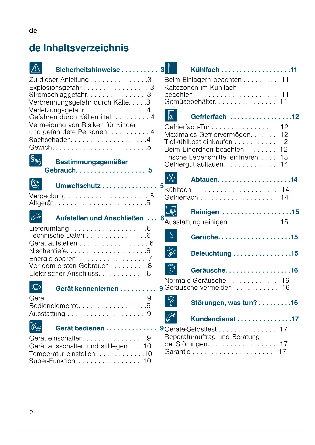 - Gerät kennenlernen . . . . . . . . . . 9 Gerät . . . . . . . . . . . . . . . . . . . . . . . . . .9 Bedienelemente. . . . . . . . . . . . . . . . . .9 Ausstattung . . . . . . . . . . . . . . . . . . . . .9 1 Gerät bedienen . . . . . . . . . . . . . . 9 Gerät einschalten. . . . . . . . . . . . . . . . .9 Gerät ausschalten und stilllegen . . . .10 Temperatur einstellen . . . . . . . . . . . .10 Super-Funktion. . . . . . . . . . . . . . . . . .10 U Kühlfach . . . . . . . . . . . . . . . . . . .11 Beim Einlagern beachten . . . . . . . . . 11 Kältezonen im Kühlfach beachten . . . . . . . . . . . . . . . . . . . . . 11 Gemüsebehälter. . . . . . . . . . . . . . . . 11 W Gefrierfach . . . . . . . . . . . . . . . . .12 Gefrierfach-Tür . . . . . . . . . . . . . . . . . 12 Maximales Gefriervermögen. . . . . . . 12 Tiefkühlkost einkaufen . . . . . . . . . . . 12 Beim Einordnen beachten . . . . . . . . 12 Frische Lebensmittel einfrieren. . . . . 13 Gefriergut auftauen. . . . . . . . . . . . . . 14 = Abtauen. . . . . . . . . . . . . . . . . . . .14 Kühlfach . . . . . . . . . . . . . . . . . . . . . . 14 Gefrierfach . . . . . . . . . . . . . . . . . . . . 14 D Reinigen . . . . . . . . . . . . . . . . . . .15 Ausstattung reinigen. . . . . . . . . . . . . 15 l Gerüche. . . . . . . . . . . . . . . . . . . .15 9 Beleuchtung . . . . . . . . . . . . . . . .15 > Geräusche. . . . . . . . . . . . . . . . . .16 Normale Geräusche . . . . . . . . . . . . . 16 Geräusche vermeiden . . . . . . . . . . . 16 3 Störungen, was tun? . . . . . . . . .16 4 Kundendienst . . . . . . . . . . . . . . .17 Geräte-Selbsttest . . . . . . . . . . . . . . . 17 Reparaturauftrag und Beratung bei Störungen. . . . . . . . . . . . . . . . . . 17 Garantie . . . . . . . . . . . . . . . . . . . . . . 17Sicherheitshinweise de