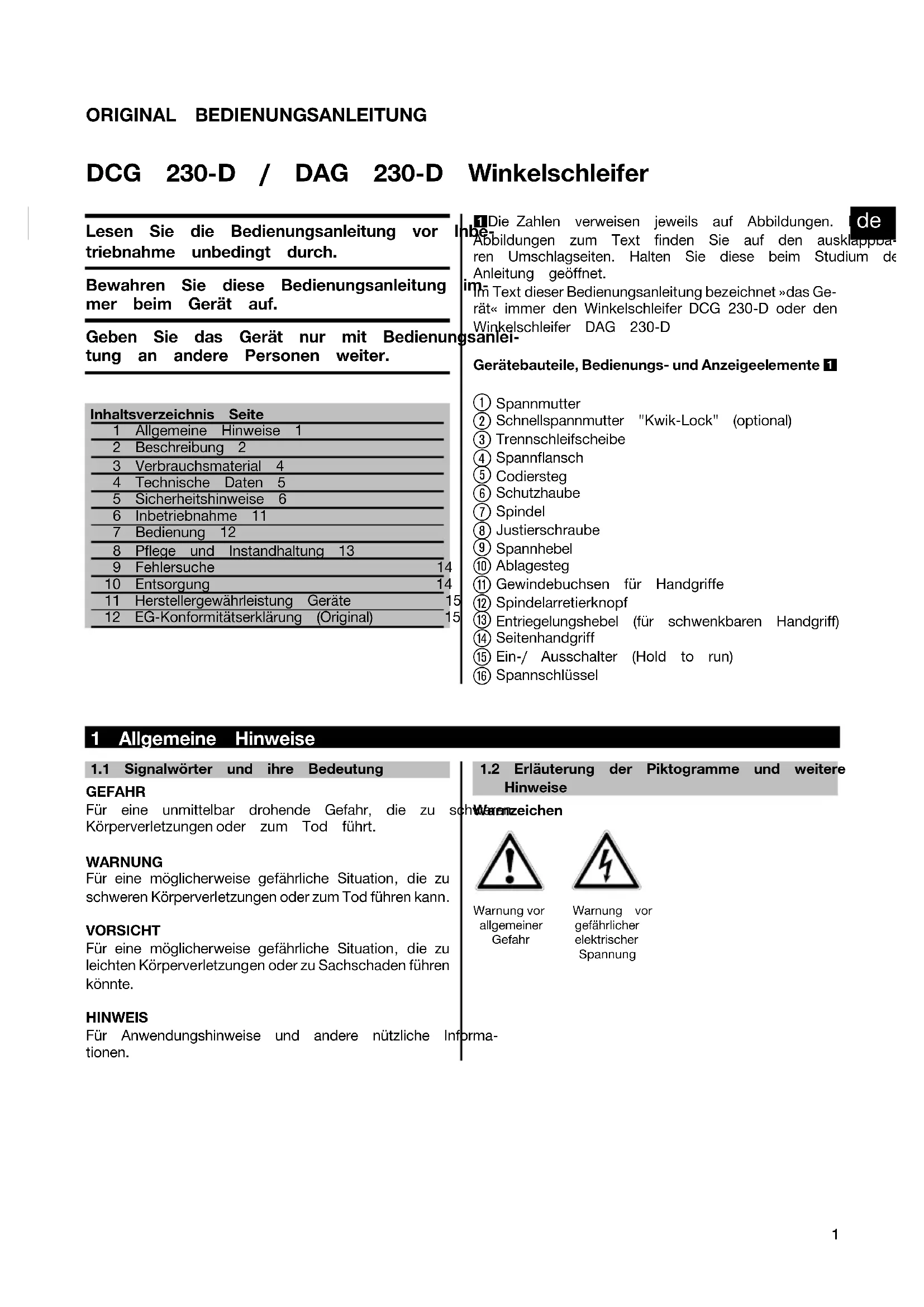 Printed: 20.11.2013 | Doc-Nr: PUB / 5069494 / 000 / 02ORIGINAL BEDIENUNGSANLEITUNG DCG 230‑D / DAG 230‑D Winkelschleifer Lesen Sie die Bedienungsanleitung vor Inbe- triebnahme unbedingt durch. Bewahren Sie diese Bedienungsanleitung im- mer beim Gerät auf. Geben Sie das Gerät nur mit Bedienungsanlei- tung an andere Personen weiter. Inhaltsverzeichnis Seite1 Allgemeine Hinweise 12 Beschreibung 23 Verbrauchsmaterial 44 Technische Daten 55 Sicherheitshinweise 66 Inbetriebnahme 117 Bedienung 128 Pflege und Instandhaltung 139 Fehlersuche 1410 Entsorgung 1411 Herstellergewährleistung Geräte 1512 EG-Konformitätserklärung (Original) 151 Die Zahlen verweisen jeweils auf Abbildungen. DieAbbildungen zum Text finden Sie auf den ausklappba-ren Umschlagseiten. Halten Sie diese beim Studium derAnleitung geöffnet. Im Text dieser Bedienungsanleitung bezeichnet »das Ge- rät« immer den Winkelschleifer DCG 230‑D oder den Winkelschleifer DAG 230‑D Gerätebauteile, Bedienungs- und Anzeigeelemente 1