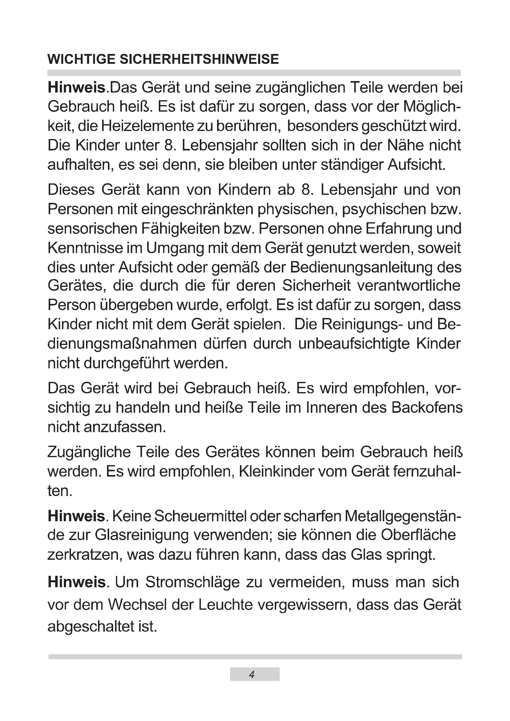 - Technische Daten WICHTIGE SICHERHEITSHINWEISE Hinweis.Das Gerät und seine zugänglichen Teile werden bei Gebrauch heiß. Es ist dafür zu sorgen, dass vor der Möglich- keit, die Heizelemente zu berühren, besonders geschützt wird. Die Kinder unter 8. Lebensjahr sollten sich in der Nähe nicht aufhalten, es sei denn, sie bleiben unter ständiger Aufsicht. Dieses Gerät kann von Kindern ab 8. Lebensjahr und von Personen mit eingeschränkten physischen, psychischen bzw. sensorischen Fähigkeiten bzw. Personen ohne Erfahrung und Kenntnisse im Umgang mit dem Gerät genutzt werden, soweit dies unter Aufsicht oder gemäß der Bedienungsanleitung des Gerätes, die durch die für deren Sicherheit verantwortliche Person übergeben wurde, erfolgt. Es ist dafür zu sorgen, dass Kinder nicht mit dem Gerät spielen. Die Reinigungs- und Be- dienungsmaßnahmen dürfen durch unbeaufsichtigte Kinder nicht durchgeführt werden. Das Gerät wird bei Gebrauch heiß. Es wird empfohlen, vor- sichtig zu handeln und heiße Teile im Inneren des Backofens nicht anzufassen. Zugängliche Teile des Gerätes können beim Gebrauch heiß werden. Es wird empfohlen, Kleinkinder vom Gerät fernzuhal- ten. Hinweis. Keine Scheuermittel oder scharfen Metallgegenstän- de zur Glasreinigung verwenden; sie können die Oberäche zerkratzen, was dazu führen kann, dass das Glas springt. Hinweis. Um Stromschläge zu vermeiden, muss man sich vor dem Wechsel der Leuchte vergewissern, dass das Gerät abgeschaltet ist.5 WICHTIGE SICHERHEITSHINWEISE Nur das Bratenthermometer, das als Ausstattung des Backo- fens mitgeliefert wurde, darf eingesetzt werden. Zur Reinigung des Backofens dürfen keine Dampfreiniger verwendet werden. Während der Pyrolyse kann der Backofen sehr hohe Tem- peraturen erreichen. Aus diesem Grunde können die Außen- ächen des Backofens heißer als gewöhnlich werden und daher ist es dafür zu sorgen, dass die Kinder sich dann in der Nähe des Backofens nicht aufhalten. Verbrennungsgefahr! Beim Önen der Backofentür kann heißer Dampf entweichen. Während oder nach dem Garvor- gang die Backofentür vorsichtig önen. Beim Önen nicht über die Backofentür beugen. Dabei sollte beachtet werden, dass der Dampf je nach der Temperatur unsichtbar sein kann. p. 424