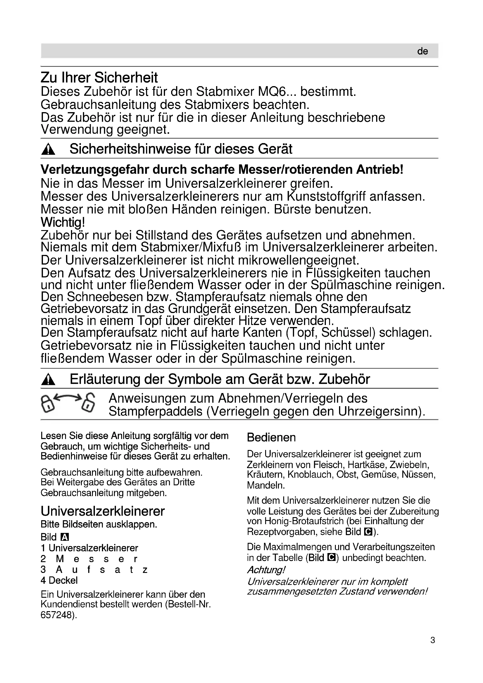 Zu Ihrer Sicherheit Dieses Zubehör ist für den Stabmixer MQ6... bestimmt. Gebrauchsanleitung des Stabmixers beachten. Das Zubehör ist nur für die in dieser Anleitung beschriebene Verwendung geeignet. , Sicherheitshinweise für dieses Gerät Verletzungsgefahr durch scharfe Messer/rotierenden Antrieb! Nie in das Messer im Universalzerkleinerer greifen. Messer des Universalzerkleinerers nur am Kunststoffgriff anfassen. Messer nie mit bloßen Händen reinigen. Bürste benutzen. Wichtig! Zubehör nur bei Stillstand des Gerätes aufsetzen und abnehmen. Niemals mit dem Stabmixer/Mixfuß im Universalzerkleinerer arbeiten. Der Universalzerkleinerer ist nicht mikrowellengeeignet. Den Aufsatz des Universalzerkleinerers nie in Flüssigkeiten tauchen und nicht unter fließendem Wasser oder in der Spülmaschine reinigen. Den Schneebesen bzw. Stampferaufsatz niemals ohne den Getriebevorsatz in das Grundgerät einsetzen. Den Stampferaufsatz niemals in einem Topf über direkter Hitze verwenden. Den Stampferaufsatz nicht auf harte Kanten (Topf, Schüssel) schlagen. Getriebevorsatz nie in Flüssigkeiten tauchen und nicht unter fließendem Wasser oder in der Spülmaschine reinigen. , Erläuterung der Symbole am Gerät bzw. Zubehör Anweisungen zum Abnehmen/Verriegeln des Stampferpaddels (Verriegeln gegen den Uhrzeigersinn). Lesen Sie diese Anleitung sorgfältig vor dem Gebrauch, um wichtige Sicherheits- und Bedienhinweise für dieses Gerät zu erhalten.Gebrauchsanleitung bitte aufbewahren. Bei Weitergabe des Gerätes an Dritte Gebrauchsanleitung mitgeben. Universalzerkleinerer Bitte Bildseiten ausklappen.Bild 1 Universalzerkleinerer2Messer3Aufsatz4 DeckelEin Universalzerkleinerer kann über den Kundendienst bestellt werden (Bestell-Nr. 657248). Bedienen Der Universalzerkleinerer ist geeignet zum Zerkleinern von Fleisch, Hartkäse, Zwiebeln, Kräutern, Knoblauch, Obst, Gemüse, Nüssen, Mandeln. Mit dem Universalzerkleinerer nutzen Sie die volle Leistung des Gerätes bei der Zubereitung von Honig-Brotaufstrich (bei Einhaltung der Rezeptvorgaben, siehe Bild