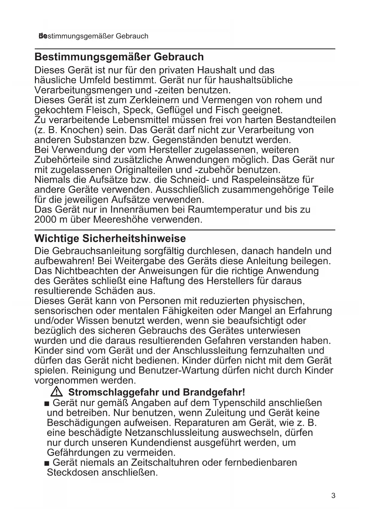 Bestimmungsgemäßer Gebrauch Bestimmungsgemäßer Gebrauch Dieses Gerät ist nur für den privaten Haushalt und das häusliche Umfeld bestimmt. Gerät nur für haushaltsübliche Verarbeitungsmengen und -zeiten benutzen. Dieses Gerät ist zum Zerkleinern und Vermengen von rohem und gekochtem Fleisch, Speck, Geflügel und Fisch geeignet. Zu verarbeitende Lebensmittel müssen frei von harten Bestandteilen (z. B. Knochen) sein. Das Gerät darf nicht zur Verarbeitung von anderen Substanzen bzw. Gegenständen benutzt werden. Bei Verwendung der vom Hersteller zugelassenen, weiteren Zubehörteile sind zusätzliche Anwendungen möglich. Das Gerät nur mit zugelassenen Originalteilen und -zubehör benutzen. Niemals die Aufsätze bzw. die Schneid- und Raspeleinsätze für andere Geräte verwenden. Ausschließlich zusammengehörige Teile für die jeweiligen Aufsätze verwenden. Das Gerät nur in Innenräumen bei Raumtemperatur und bis zu 2000 m über Meereshöhe verwenden. Wichtige Sicherheitshinweise Die Gebrauchsanleitung sorgfältig durchlesen, danach handeln und aufbewahren! Bei Weitergabe des Geräts diese Anleitung beilegen. Das Nichtbeachten der Anweisungen für die richtige Anwendung des Gerätes schließt eine Haftung des Herstellers für daraus resultierende Schäden aus. Dieses Gerät kann von Personen mit reduzierten physischen, sensorischen oder mentalen Fähigkeiten oder Mangel an Erfahrung und/oder Wissen benutzt werden, wenn sie beaufsichtigt oder bezüglich des sicheren Gebrauchs des Gerätes unterwiesen wurden und die daraus resultierenden Gefahren verstanden haben. Kinder sind vom Gerät und der Anschlussleitung fernzuhalten und dürfen das Gerät nicht bedienen. Kinder dürfen nicht mit dem Gerät spielen. Reinigung und Benutzer-Wartung dürfen nicht durch Kinder vorgenommen werden. W Stromschlaggefahr und Brandgefahr! ■ Gerät nur gemäß Angaben auf dem Typenschild anschließen und betreiben. Nur benutzen, wenn Zuleitung und Gerät keine Beschädigungen aufweisen. Reparaturen am Gerät, wie z. B. eine beschädigte Netzanschlussleitung auswechseln, dürfen nur durch unseren Kundendienst ausgeführt werden, um Gefährdungen zu vermeiden. ■ Gerät niemals an Zeitschaltuhren oder fernbedienbaren Steckdosen anschließen.4 de Wichtige Sicherheitshinweise ■ Gerät nicht auf oder in die Nähe heißer Oberflächen, wie z. B. Herdplatten, stellen. Das Netzkabel nicht mit heißen Teilen in Berührung bringen oder über scharfe Kanten ziehen. ■ Das Grundgerät niemals in Flüssigkeiten tauchen oder unter fließendes Wasser halten und nicht im Geschirrspüler reinigen. Keinen Dampfreiniger benutzen. Das Gerät nicht mit feuchten Händen benutzen. ■ Das Gerät muss nach jedem Gebrauch, bei nicht vorhandener Aufsicht, vor dem Zusammenbau, Auseinandernehmen oder Reinigen und im Fehlerfall stets vom Netz getrennt werden. ■ Das Gerät während des Betriebs stets beaufsichtigen! W Verletzungsgefahr! ■ Netzstecker erst einstecken, wenn alle Vorbereitungen zum Arbeiten mit dem Gerät abgeschlossen sind. ■ Vorsätze nur im komplett zusammengesetzten Zustand verwenden. Vorsätze nie am Grundgerät zusammenbauen. ■ Vor dem Auswechseln von Zubehör oder Zusatzteilen, die im Betrieb bewegt werden, muss das Gerät ausgeschaltet und vom Netz getrennt werden. Nach dem Ausschalten läuft der Antrieb kurze Zeit nach. Vollständigen Stillstand des Antriebs abwarten. ■ Bei Unterbrechung der Stromzufuhr bleibt das Gerät eingeschaltet und läuft danach wieder an. ■ Nicht in die scharfen Messer und Kanten der Schneid- und Raspeleinsätze greifen. Niemals in rotierende Teile greifen. Niemals mit den Händen in den Füllschacht oder in die Auslassöffnung greifen. ■ Zum Nachschieben immer den Stopfer verwenden. ■ Die scharfen Messer und Kanten der Schneid- und Raspeleinsätze niemals mit bloßen Händen reinigen. W Achtung! ■ Darauf achten, dass sich keine Fremdkörper im Füllschacht oder in den Aufsätzen befinden. Nicht mit Gegenständen (z. B. Messer, Löffel) im Füllschacht oder in der Auslassöffnung hantieren. ■ Niemals Ein-/Aus-Taste und Umkehrlauf-Taste gleichzeitig benutzen. Vor Betätigung der anderen Taste den vollständigen Stillstand des Antriebes abwarten. Gefahr von Geräteschäden. W Erstickungsgefahr! Kinder nicht mit Verpackungsmaterial spielen lassen. W Wichtig! Das Gerät nach jeder Verwendung oder nach längerem Nichtgebrauch unbedingt gründlich reinigen. X „Reinigen und Pflegen“ siehe Seite 85